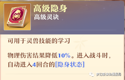 隐身技能分为普通和高级,【高级隐身】的效果是:自身物理伤害结果降低10%,进入战斗时,自动进入4回合的隐身状态,隐身状态下只能使用普攻、防御、保护和吃药,其他任何行为都会直接失去隐身效果。