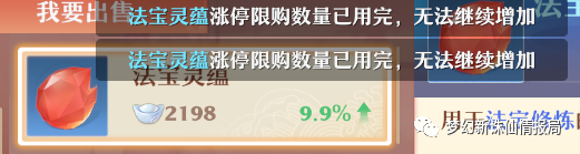 同时,几个注意事项需要提醒各位:(1)相对来说被动法宝的培养优先级大于主动法宝。(2)在银子充裕的情况下,每天凌晨交易行中的法宝灵韵第一时间记得抢购,不然涨停你只能买20个。