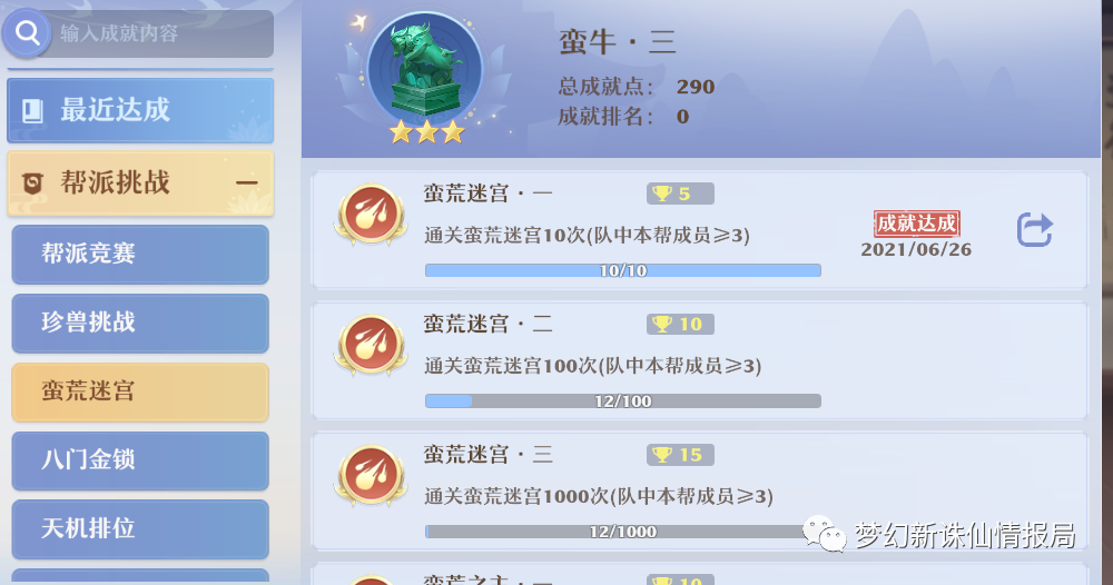 帮派成就可以通过完成各项任务来获得,作为帮派的管理人员,应该有组织性的去提醒帮派成员完成,比如下图中有些任务是需要队伍里本帮人数≥3个才能完成的,也鼓励帮里的队员互相组成固定队。