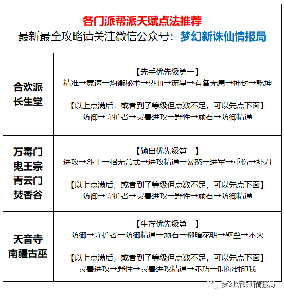 帮派天赋一共分为四种:灵兽、输出、生存、先手,从字面上就很好理解:(1)灵兽天赋全门派通用(2)输出天赋鬼王、万毒、青云、焚香优先考虑(3)生存天赋天音、南疆优先考虑(4)先手天赋合欢、长生优先考虑