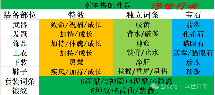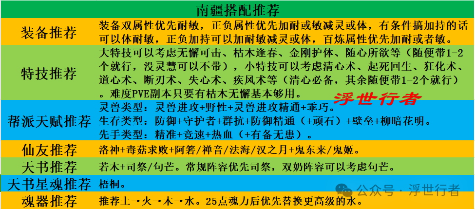 全方位解析如何打造一个合格的南疆! 装备推荐: 装备双属性优先耐敏,正负属性优先加耐或敏减灵或体,有条件搞加持的话可以体耐敏,正负加持可以加耐敏减灵或体,百炼属性优先加耐或者敏。 特效推荐: 武器:致命/祝福/成长。 发冠:加持/成长。 饰品:加持/体魄/成长。 上衣:加持/成长。 下装:灵慧。 鞋子:疾风/加持/成长。 不打架或者平民玩家可以只搞个灵慧下装(打不出来可以用灵武将就),其他位置搞个满属性双加就行。 特技推荐: 大特技可以考虑无懈可击、枯木逢春、金刚护体、随心所欲等(随便带1-2个就行,没灵慧可以不带),小特技可以考虑清心术、起死回生、狂化术、道心术、断刃术、失心术、疾风术等(清心必备,其余随便带1-2个就行)。难度PVE副本只要有枯木无懈基本够用。 词条推荐: 套装词条:6涅槃/2神隐+4涅槃/6隐怒。 独立词条:岐黄+背水/破釜+神愈+铁脊/止水+净厄+扶摇/重犀/星佑。 锻纹推荐: 6坤纹+6武曲/紫薇。 宝石推荐: 武器:翡翠。 发冠:孔雀石。 饰品:猫眼石。 上衣:翡翠/猫眼石。 下装:珍珠。 鞋子:珍珠。 上衣可以准备两个宝石随时切换,打架带猫眼石,副本可以带翡翠。 法宝推荐: 主动法宝: 浮屠金钵+九品金莲+追命弩/乾坤戒+阴阳镜/摄心铃/黑血精珠。 一般还是扔锅和金莲的机会多点。 元素法宝: 神火罩/玲珑塔+饶雪炉。 队友需要抢速度扔冰,不需要的话就扔火或者电(配合队友降防或者降亲和)。 被动法宝: 兽骨幡/灵妖幡+鹤云幡+六合镜/青灵镜/般若木鱼+玲珑石。 能洗不佩戴生效的被动法宝全都洗(前提是有用),根据不同场景搭配不同的被动法宝。 帮派天赋推荐: 灵兽类型:灵兽进攻+野性+灵兽进攻精通+乖巧。 生存类型:防御+守护者+群抗+防御精通(+顽石)+壁垒+柳暗花明。 先手类型:精准+竞速+热血(+有备无患)。 PVP打架点后两条,灵兽竞技场优先点前两条。 仙友推荐: 洛神+毒菇求败+阿箬/禅音/法海/汉之月+鬼东来/鬼姬。 天书推荐: 若木+司祭/句芒。 常规阵容优先司祭,双奶阵容可以考虑句芒。 天书星魂推荐: 梧桐。 点灯有概率额外施加星月歌还是挺香的。 魂器推荐: 推荐土→火→木→水(抗封2抗法爆3),25点魂力后优先替换更高级的水。对于治疗门派面板的优先级相对低点。也可以考虑搭配金土火木(抗封2物抗2)、金土火水(物抗2抗物爆3)、木水金土(法抗2抗物爆3),土木水金(法抗2抗法暴3),根据对面的阵容威胁进行调整。 门派定位: 目前南疆PVP出场率还是要略高于天音的,本来副本会逊色于天音(大招实在太好用了),但是因为现在法宝宝在难度PVE副本的统治地位,而南疆的星月歌可以提升法攻,所以相对来说在两个治疗门派里面优先级更高一点。 以上就是本期全部内容,更多门派攻略,请锁定叶子猪《梦幻新诛仙》官方合作专区。 |