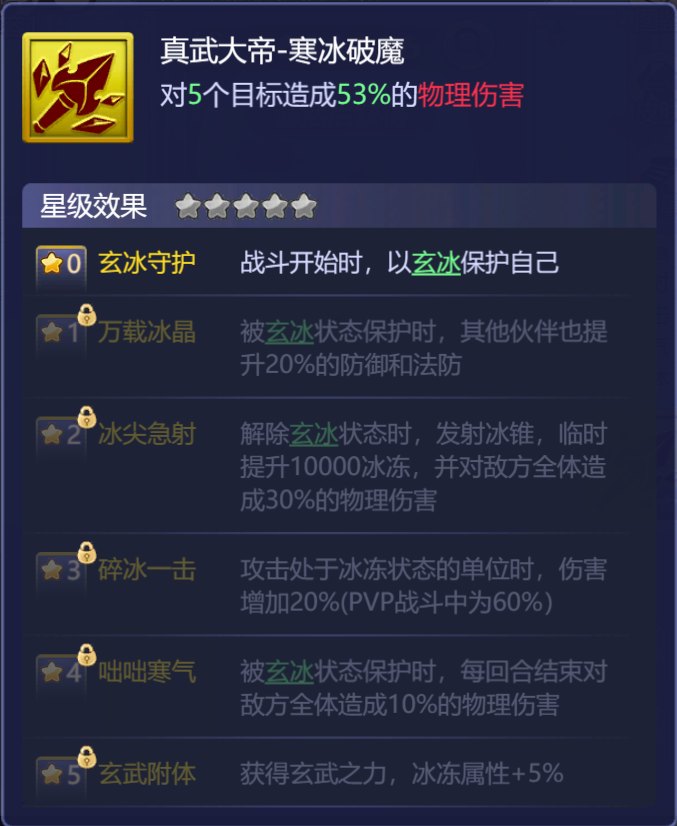 《梦幻西游网页版》全新金色物理伙伴“真武大帝”来了,今天给大家讲讲这位新伙伴的强度以及定位问题,如果你打算培养他,请读完本文。 伙伴品质:金色 伙伴类型:物理 真武大帝-寒冰破魔: 对5个目标造成53%的物理伤害 玄冰守护: 战斗开始时,以玄冰保护自己 玄冰 防御、法防+120% 不受异常状态的影响 无法攻击,于第3回合开始时解除 万载冰晶: 被玄冰状态保护时 其他伙伴也提升20%的防御和法防 我方伙伴在前两回合的抗性得到提升。 冰尖急射: 解除玄冰状态时,发射冰锥 临时提升10000冰冻 并对敌方全体造成30%的物理伤害 强大的面伤类技能,冰冻的提升可以带来一定控制能力。 碎冰一击: 攻击处于冰冻状态的单位时 伤害增加20%(PVP战斗中为60%) 配合2星技能,对冰冻单位带有增伤效果,PVP战斗中更为明显。 咄咄寒气: 被玄冰状态保护时,每回合结束对 敌方全体造成10%的物理伤害 升至4星,在无法行动时也开始拥有群体输出能力。 玄武附体: 获得玄武之力,冰冻属性+5% 冰冻能力得到显著增强,强化二、三、四星技能,可以打出持续的控制和高额伤害。 本月金色物理伙伴再添一员猛将,真武大帝拥有高数值面伤的同时,兼备强大的防御及控制机制。 从技能上看,真武大帝的定位更偏向于PVP战斗。 前两回合的无法行动为我方伙伴带来抗性加持,而后带来强大的冰冻能力提升,属于后发制人型的反制类伙伴,面对高爆发的牛魔王阵容可以发挥一定的效果。 基础技能玄冰,前2回合抗性得到大幅提升且免疫异常,在常规玩法中,面对带有优先攻击速度最慢/最快单位效果的怪物战斗时,通过调整伙伴的站位,可以发挥一定的承伤作用。 核心技能冰尖急射,在第3回合触发,对敌方全体单位造成带有高加成冰冻效果的面伤,具备强大控制能力的同时兼顾输出效果。 升至三星后,提升对冰冻单位的输出能力,在PVP战斗中为60%,直接的高额增伤。 四星则是可以一定程度上弥补前2回合无法行动时的输出空缺,每回合带来持续伤害,同时搭配五星技能的冰冻属性强化,可以带来持续的控制能力。 由此看来,真武大帝是一位为PVP量身打造的物理型伙伴,兼备抗性、控制及强大的输出能力。 培养建议方面: 0星-1星可满足日常使用需要,2星激活核心技能,带来质变; 3星开始获得显著增伤效果,进入强势期; 4星拥有每回合造成额外输出的能力; 5星冰冻能力再次得到提升。 由于金伙伴的培养难度较高,少侠们可根据自己的需求进行选择~ 更多游戏资讯,请锁定叶子猪《梦幻西游网页版》官方合作专区。 编辑:叶子猪小秘书