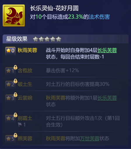 今天给大家介绍一下,梦幻西游网页版全新红色伙伴“长乐灵仙”的属性以及技能介绍,一起来了解一下。 伙伴品质:红色 伙伴类型:法术 长乐灵仙-花好月圆: 对10个目标造成23.3%的法术伤害 秋雨芙蓉: 战斗开始时自身附加4层长乐芙蓉状态,每回合结束时层数-1 长乐芙蓉: 造成的伤害+10%,可叠加 万世芙蓉: 造成的伤害+15%,可叠加 含苞放: 暴击伤害+12% 伤害上限得到提升。 破土生 : 对土五行的目标伤害提高30% 针对土五行目标可以大幅度提高伤害值。 云裳婉: 秋雨芙蓉将额外附加1层长乐芙蓉 状态 核心技能得到增强,再次提高面伤能力。 别霜土: 对土五行目标额外攻击1次(第1回合生效) 面对土五行目标时在首回合可触发两段攻击。 照芙蓉: 秋雨芙蓉将附加万世芙蓉状态 终极技能,输出能力再次得到大幅提升,且可叠加。 长乐灵仙的出现使秒10伙伴再添一员,稳定的攻击数量及简单粗暴的技能机制将使其成为常规多怪战斗中的一把好手。 对比两个稳定秒10伙伴,布雨神君的亮点在于功能性,长乐灵仙的定位则更加偏向于直截了当的面伤输出。 在多项增伤技能的加持下,输出能力并不逊色于其他多单位群秒伙伴。 核心技能秋雨芙蓉,使长乐灵仙在首回合可获得40%的伤害提升,升至3星及5星后,该技能带来的提升效果会再次得到显著增加。 升至2星后拥有对土五行单位增伤的能力,配合4星技能,可在面对土五行多怪战斗时,在首回合打出不俗爆发。 相比起其他多单位群秒伙伴(攻击数量≥6),长乐灵仙的优势主要体现在前面回合的输出集中,以及对特定五行目标带来的大幅增伤效果。 面对10个多血量单位的战斗时,在伙伴的选择优先级上将更为灵活。 培养建议方面, 0星-1星:可作为常规秒10伙伴使用; 2星:提高对土五行单位的输出能力; 3星:核心技能得到强化,伤害提升及续航回合得到增加; 4星:进入强势期,面对土五行单位的输出能力得到大幅提升; 5星:进入完全体,在原有的基础上,再次强化核心技能秋雨芙蓉,产生质变。 红色伙伴的培养难度相对于金色伙伴来说较易,少侠们可根据自己的需求进行选择。 更多伙伴资讯,请锁定叶子猪《梦幻西游网页版》官方合作专区。 编辑:叶子猪小秘书
