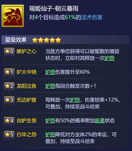 梦幻西游网页版近期推出了全新金色伙伴“瑶姬仙子”,下面让我们一起来了解一下这个新宠有什么特点以及培养的方式。 技能总览 机制详解 伙伴类型:法术 攻击数量:4 瑶姬仙子-朝云暮雨 对4个目标造成61%的法术伤害 嫉妒之心 当敌方单位获得可以被驱散的增益 状态时,立即对其释放一次妒怨 高百分比法术秒4,结合基础技能嫉妒之心,自带驱散效果的同时还带有追击能力。 升至1、2星后,触发妒怨技能后伤害得到显著提升,且妒怨每回合可额外触发一次,适用于怪物拥有多层增益buff的战斗。 3星时带来质变,核心技能得到增强,妒怨技能伤害提升并可叠加。 升至4星后,瑶姬仙子开始具备控制能力,在驱散的同时还可附加眩晕状态,在保证高额输出的前提下,功能性更加全面。 5星后拥有降低敌方的幸运值的能力,敌方生存及续航能力得到限制,更易被施加异常状态。 伙伴短评 在面对怪物拥有增益buff的战斗情况,少侠们通常都会选择带上驱散类伙伴,而瑶姬仙子的出现正好弥补了现有驱散伙伴群秒数量/伤害上的缺陷。 升至高星后,瑶姬仙子亦可兼顾控制类伙伴的角色,基础技能自带高额法伤,升星后的提升主要体现在功能性更加全面,以及伤害上限的提升。 此外,瑶姬仙子最大的亮点在于,可以降低敌方的幸运值,降低了敌方的输出及续航能力,为我方输出和生存提供了保障。 培养建议: 0星可满足常规驱散/群秒伙伴的日常使用; 1星-2星输出能力得到显著提升; 3星进入强势期,输出上限再次得到提升; 4星开始拥有控制能力; 5星得到质变,开始拥有降低敌方幸运值的能力。 五色石选择推荐:苍松 关于这次的全新金卡 大家有什么看法呢? 欢迎在评论区留言哦~ 更多资讯,请锁定叶子猪《梦幻西游网页版》官方合作专区。 编辑:叶子猪小秘书