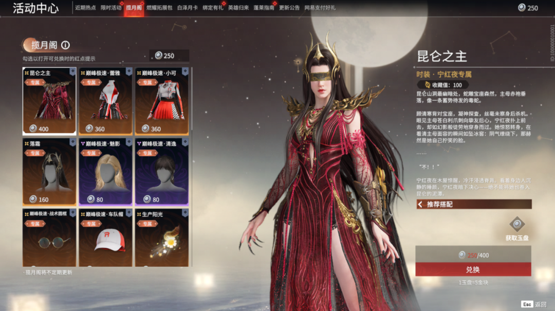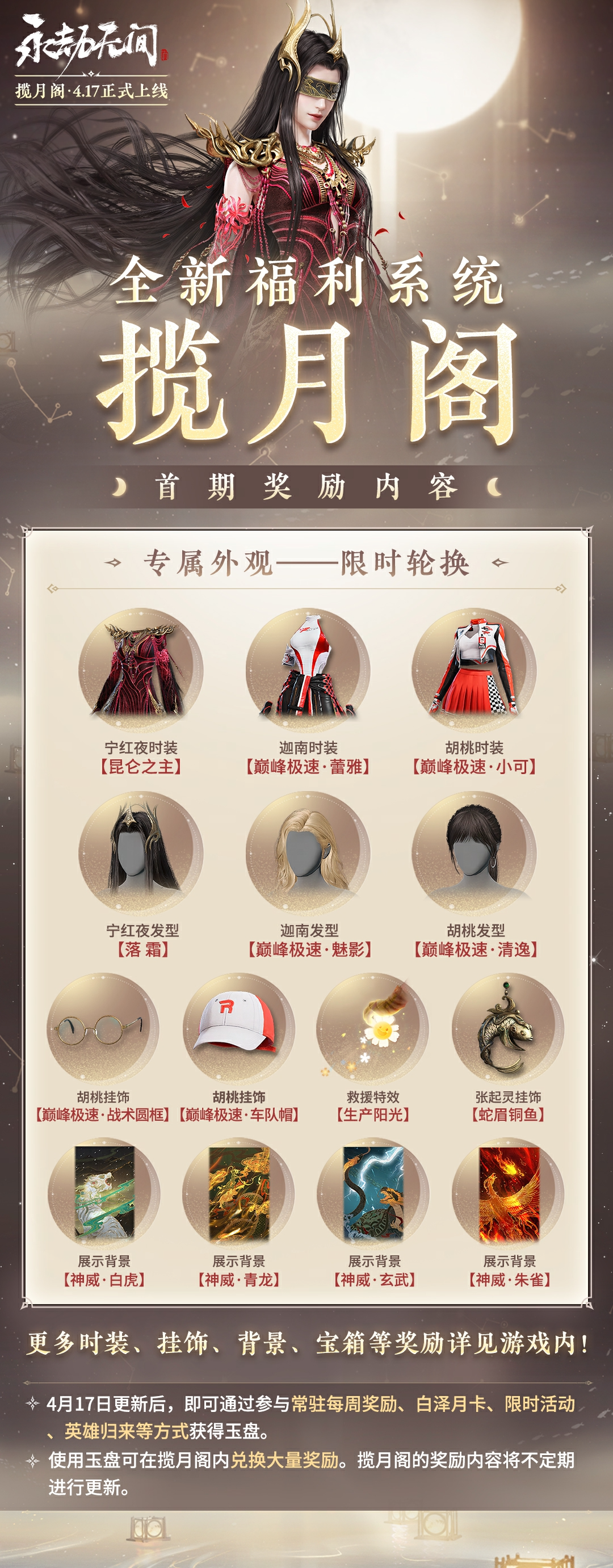 【昆仑之主】宁红夜、领航员胡桃、赛车手迦南免费拿? 赛季宝箱、极品英雄时装、极品武器皮肤统统自选得? 能开出2000金块的宝箱,有210个? 全都是真的!而且不止这些!! 全新福利系统【揽月阁】携四大福利活动4月17日登场,兄弟们准备上号拿金块! 01全新福利系统【揽月阁】送送送! 宁红夜竟然变成了昆仑主母?胡桃担任领航员,和赛车手迦南极速出发! 是的,宁红夜极品时装【昆仑之主】、永劫无间X巅峰极速联动外观——胡桃极品时装【巅峰极速·小可】、迦南极品时装【巅峰极速·蕾雅】即将上线! 省流图: 这么多外观全都可以免费拿到 是的!全部免费拿! 4月17日起,全新福利系统【揽月阁】正式上线,使用道具【玉盘】,海量奖励等你来换! 揽月阁内奖励内容将不定期进行更新,第一期劫宝就为大家带来宁红夜、迦南、胡桃的三套全新时装,还有20+奖励可兑换! 宁红夜极品时装【昆仑之主】 胡桃极品时装【巅峰极速·小可】