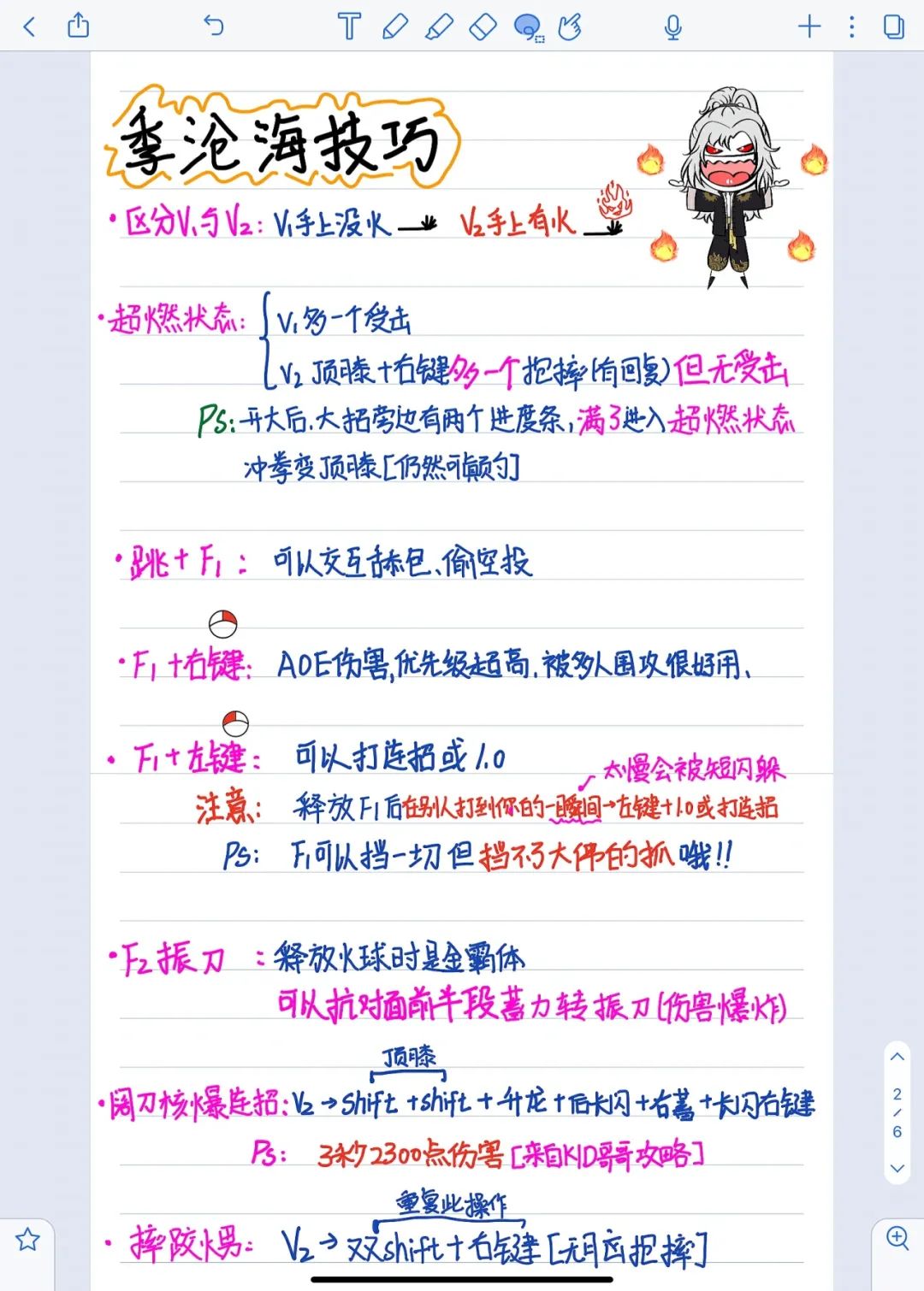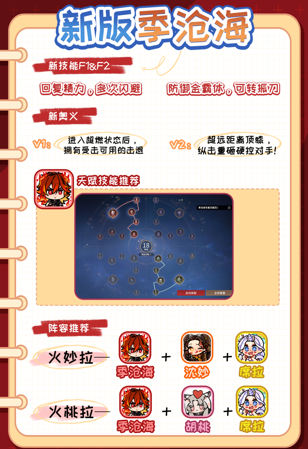 改版后的季沧海现已上线,可是总感觉,怎么火男在别人手里就是火神,在劫宝手里就“熄火”了…… 我也是火速请教了抖音@KID哥哥、@青霖(永劫无间),给大家分享分享,新版季沧海到底怎么爽玩! 省流图话不多说,省流版小抄看这里! 此外,来自小红书的课代表@一颗p??也为大家制作了一份新版季沧海的详细说明书,用三张图带你了解新版季沧海! 众所周知,玩季沧海一定要学好连招才够爽!今天劫宝就从技能与奥义两个方面出发,介绍介绍季沧海改版后到底怎么玩,还附赠连招推荐! 季沧海技能介绍 技能重点讲解 调整后的季沧海,F1【燎原劲】可以回复精力,还新增了超高伤害的纵击反击,让季沧海能在当下激烈的战斗环境里能进退自如; 纵击反击对前方范围内敌人造成较高伤害 F2【燎原劲·巨焰】可以使自身获得防御金霸体效果,两个技能都非常推荐携带,英雄们可以根据自己的需求进行选择! 素材来源:抖音@青霖(永劫无间) 连招推荐 @青霖(永劫无间)为大家推荐一套携带F2【燎原劲·巨焰】的高伤连招,练好轻松变火神! 素材来源:抖音@青霖(永劫无间) 太刀升龙接滑铲升龙,再接双跳A可以稳定接火球,最后衔接一个蓄力,一套打出高额伤害! 而可以回复精力的F1【燎原劲】,可以在抵挡后点击左键衔接升龙,同样可以打出超高伤害! 素材来源:抖音@搞笑的涛弟 季沧海奥义介绍 奥义重点讲解 先讲一个玩新版火男必备的知识点:季沧海开启奥义后,造成打击或收到打击都会积累超燃值,积累满会进入【超燃】状态,在这个状态下的二段闪避会变成顶膝招式。 【超燃】状态二段闪避替换为顶膝招式 V1【迅烈如火】在进入超燃状态后,点按奥义键还可击退敌人,受击中可用! V2【迅烈如火·狂战】在进入超燃状态后,顶膝后按纵击可以向前突击并重砸敌人,对新手非常友好! 素材来源:抖音@KID哥哥 连招推荐 @KID哥哥也为大家带来了携带V1或V2均可使用的“核爆流”连招介绍! 素材来源:抖音@KID哥哥 在冲拳或顶膝打中后,使用下蹲(C)加右键升龙击飞,然后长按SHIFT+S后长闪取消升龙后摇,最后使用右蓄1.0打出爆炸伤害! 看完了技能奥义解析和连招推荐,当然也不能少了天赋和阵容! 天赋推荐 “精力”是当前版本季沧海的一个非常重要的关键词,所以推荐大家在加点时点满精力和受伤转怒,既能续航,也有充足的精力打出连招! 阵容推荐 前几日官方训练赛中YZG战队使用的火妙拉以及BAODA战队使用的火桃拉,两套阵容都非常适合大家在三排当中使用! 阵容一:火妙拉 新版季沧海搭配上拥有站场能力的沈妙和容错能力的席拉,既能在三排的战场里保证高额输出,也能有效保障全队生存! 阵容二:火桃拉 “双皮奶”搭配季沧海,能够大大保证季沧海的输出,对于点杀阵容也有一战之力! 新版本开启永劫淘金周! 十五项海量更新,季沧海重生归来、全新燃耀宝炉、全新机制等等超多新内容等你上号体验,这个五一就上永劫爽玩! 现在上号,幻梦宝箱任选礼*5(包含燃耀宝炉在内的全部宝箱任选)、全新落物堆皮肤【茶饮】即可在邮箱处领取! 5月6日,还有包含幻梦宝箱任选礼*2的专属福利,打开邮箱直接领! 此外,我们还额外在邮件发放了幻梦宝箱任选礼*1、玉盘*20、玄火石*50、掘灵币*100,现在上号就能领取! 编辑:月光下完美