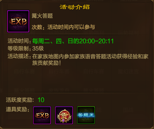 各位将军好呀!今晚国战在即,相信许多将军已经摩拳擦掌,随时准备大展拳脚! 大战之后,可别忘了原始征途还有许多轻松趣味玩法,助你放松身心!告别战斗,轻松点击即可获得海量经验、神秘宝箱等奖励!一起来看看吧! 自行车赛 开放时间 每周二、三、四、六 19:00-21:00 玩法介绍 活动开放期间,将军可在凤凰城自行车赛发令员处参与比赛,依次访问完所有的赛车女郎即可完成比赛! 完成自行车赛后将获得大量经验及神秘宝箱奖励。 玩法攻略 1、掐点蹲守,即刻出发! 想在自行车赛中获得名次,一定得提前入场,不然可能会错过抢先发车的机会哦~ 2、活用道具,加速冲线! 若第一个道具为加速,无需马上使用!如果周边玩家获得的是状态道具,很可能会让你陷入“失明”、“摔跤”等负面状态,从而浪费掉宝贵的加速机会。将军可等自己离开了可能被道具波及到的范围后再使用加速,抢占先机,加速冲线! 魔幻迷宫 开放时间 每周一、五、日 19:00-21:00-21:00 玩法介绍 将军可前往凤凰城迷宫传送者处进入魔幻迷宫,进入第5、10、15、20、25层即可找到经验王,获得大量经验奖励,助你等级更上一层楼! 玩法攻略 1、勤于记录,层层试错 想要先行通关魔幻迷宫,除了运气以外,还需要将军精神上的绝对专注,记录每一层对错结果,层层试错,直达25层! 2、关注频道,好人相助 只想躺平蹭经验的将军也可选择随时关注迷宫开启后的世界、家族频道!征途好人多,自然会有先行者愿意在频道中分享迷宫密码~ 篝火答题 开放时间 每周二、四、日 20:00-20:11 玩法介绍 围坐篝火旁,争做答题王。将军可前往家族地图参与篝火答题,各种趣味问答层出不穷,不仅可以获得大量家族贡献、经验值,还有机会赢得答题王限定聊天前缀! 家族龙舟 开放时间 每周三、六 20:00-21:00 玩法介绍 团结一心,共闯龙舟赛!家族族长、副族长报名即可让家族成员参与龙舟初赛。 根据最终排名,可获得不同数额的家族贡献度奖励! 温泉泡汤 开放时间 每周六 21:00-23:59 玩法介绍 温泉泡汤,轻松一夏!活动期间,角色等级达到61级的将军即可参与。 访问男、女接待员还可领取到额外经验,还能顺带完成情缘任务哦~ 无需战斗,泡泡温泉就能领经验,岂不美哉! 结束了国战中的打打杀杀,将军们也可体验一下这些趣味玩法,给自己的身心放个假~ 以上就是休闲玩法盘点,将军们对游戏中的休闲趣味玩法还有什么创意和建议,欢迎在评论区留言哦~ 更多游戏攻略,请锁定叶子猪《原始征途》手游官方合作专区。 编辑:叶子猪小秘书