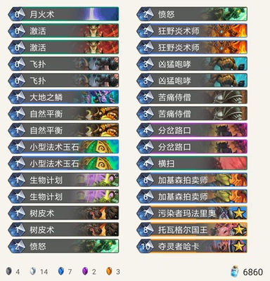 大部分的德鲁伊卡组都遭到了削弱,但奇数德应该是得到了史诗级的加强,终于可以带上成长啦,好开心呀;前期依靠英雄技能就能勉强控制场面,法术玉石也升级得非常快;虽然没有滋养等过牌组件,但动物灵可以给德鲁伊过牌,还有机会配合贡克刷一波呢,爆发是依靠一些高质量的野兽。 BuckNastyZB·控制法