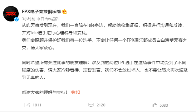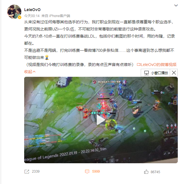 自Uzi官宣复出之后,他所在的直播间以及所处的网络环境就越来越差。Rank时经常被演员弄得心态爆炸,许多沉寂依旧的黑粉也卷土重来。伴随着《孤泳者》吹起冲锋号角,Uzi复出后这一个月以来风评极为恶劣。而昨晚的一场排位,又引发了新的争议性事件。 由于战队大名单已经确定BLGvsOMG的比赛Uzi上不了场,所以昨晚Uzi一个人打起了排位。可对局中辅助玩家光辉的各种逛街行为导致的对局失利,致使Uzi和打野产生了强烈不满。在吐槽了辅助几句后,对方在结算界面开始问候Uzi的家人。 这场出现在众目睽睽之下的事件,很快有了后续。通过OBGG的账号信息,Uzi的粉丝们扒出了骂人的光辉疑似FPX辅助Lele,紧接着就对其展开了爆破行动。 于是乎,今天凌晨Lele打完训练赛以后就惊讶地发现,自己的微博收到了700+的私信问候。随即就发布了一条动态回应自己并不是那个账号的持有者。实际上选手们的超级号早在一周前就被回收了,OBGG的账号信息并不属实。 为此Lele还拿出了Uzi打排位时,自己同一时间段在进行另一场对局的证据。视频显示当时Lele正在玩布隆,而非光辉辅助。 作为一个实际上的受害者,Lele在澄清这件事的微博中甚至还放低了姿态。作为上个赛季还待在RNG的新人辅助选手,对于Uzi这位前辈他的心中只有仰慕:“从来没有过任何侮辱其他选手的行为,我打职业到现在一直都是很尊重每个职业选手,更何况我之前跟UZi一个队伍,不可能对非常尊敬的前辈进行这种语言攻击。” 这件事当前仍在发酵,话题阅读已经超过了1.1亿。可事情发展到这一步,两个选手被摆到了烤炉上,受到他人的非议,真正促成这件事去爆破Lele的狂热粉丝,却一个个都没影了。 对于Lele的遭遇,FPX在今天中午发布了公告明确表示会陪在Lele身边帮助他收集证据、进行心理疏导,并且“不会放过一个坏人。”最后不忘告诫网友们应该理智发言,避免伤害到无辜的人。 后续BLG战队也对这件事予以了回应,并确定了Lele所说的情况属实。当然,大家也希望看到Uzi本人能对这件事予以回应,解除选手间的误会。 当前Uzi的处境非常尴尬,无法上场比赛使得他难以扭转现在的风评。直播时节奏不断,他自己也坦言已经很久没有看过弹幕了。黑子、白子间的对线,最终所造成的问题还得他来买单。Rank时因为演员而产生的PTSD,对他的心态也造成了巨大的影响。 这些麻烦出现的源头是由于Uzi想要打比赛,可解决问题的方式也是上场打比赛。只有好的战绩,才能让舆论环境不再处于对立状态中。只是不知道在年前,LPL的观众们能否见到Uzi回归后的首秀了。 编辑:F