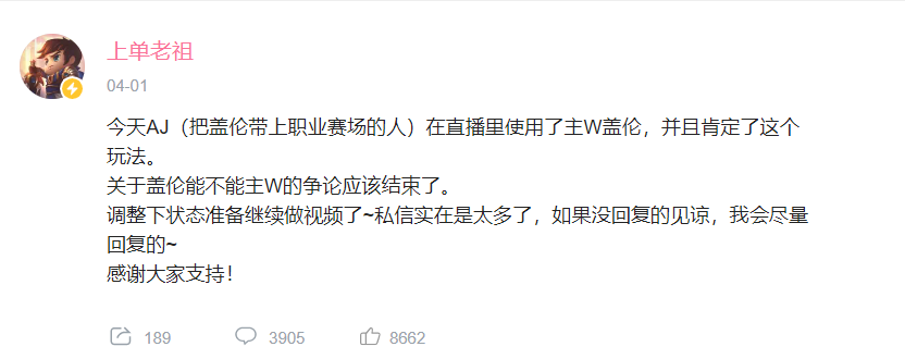 在3月底的时候,因为B站91.7万粉丝UP主“上单老祖”发布主W盖伦上分玩法,跟另一个盖伦绝活哥“店长盖伦”产生网络骂战之后,导致全网玩家都开始对这个奇葩到不能再奇葩的盖伦打法产生了好奇,想要一探主W盖伦的含金量。而在最近,Doinb作为一名职业选手,公开在直播间内怒撕了这个奇葩的玩法。 因为Doinb恰好在放假期间放松自己的缘故,就在白银二的对局内使用了中单盖伦的打法,也勾起了网友对于主W套路的好奇。对于弹幕能否主W的询问,Doinb直播原话为:“主W的人到底是什么意思啊,我都没见过主W的盖伦,他有没有玩过这个游戏啊?”,“有绝活哥说主W,绝活哥应该玩得比我好吧?但这个主W就是来混的吧?W只加盾跟减CD,有什么用啊?”,“盖伦肯定是主E副Q啊,哪有人主W的,你让那个人先过来排到我,再说组主W的事情,这个人铁定是个NT!”…… 总而言之,就连全LPL全能混的中单选手Doinb都对上单老祖所谓的主W打法嗤之以鼻,认为这个套路毫无胜率可言,更不用说,其他的盖伦绝活哥跟职业选手了,大家基本上就没想过盖伦还有主W的一天。 对此不少网友也表示:“盖伦可以出肉,但是不能主w”,“这有啥,我也来,剑魔该主E”,“不懂就问,和致命节奏石头人比,哪个好用”。但上单老祖目前还是十分嘴硬在B站表示:“今天AJ(把盖伦带上职业赛场的人)在直播里使用了主W盖伦,并且肯定了这个玩法,所以关于盖伦能不能主W的争论应该结束了。” 也不知道这场有关盖伦主W的风波,又究竟会持续多久?毕竟是B站91.7W粉的大主播,一些职业选手也惹不起这位UP主。 编辑:月光下完美
