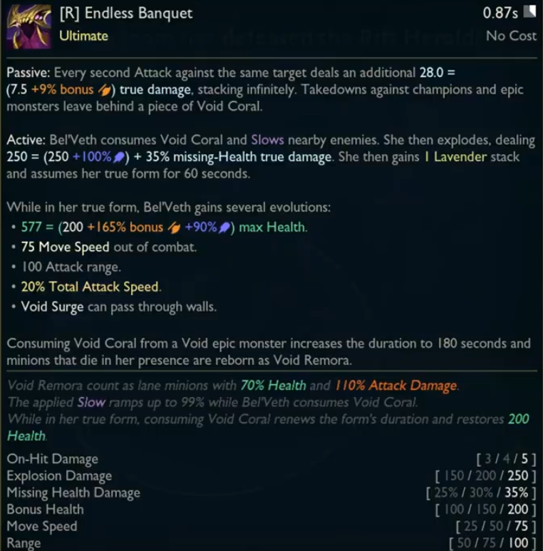 “起了,被一个大逼兜秒了有什么好说的嘛?”前不久才刚在英雄联盟的新CG中,被新英雄虚空女皇-卑尔维斯暴打的卡莎,就是这样向玩家们解释事情的经过的。 拳头设计师对虚空女皇-卑尔维斯的上线铺垫已久,早在年初便已经确定了虚空打野的出场。作为迄今为止最为强大的虚空生物,秒杀、腐蚀卡莎对她来说完全不费吹灰之力。而在背景故事以及此次的CG视频中,卑尔维斯也都展现了自己所拥有的,能影响故事走向的实力。 根据官方透露的信息,大多数玩家想必光是看新英雄的技能描述文本,就感到让人头大。不过通常情况下,要想快速评判一个英雄的强度,往往只需要看TA的被动及大招效果就能得出结论,卑尔维斯也不例外。 卑尔维斯的被动有两个:其一是通过击杀大型野怪和英雄,获得的无上限攻速成长。 其二是大招被动,能让卑尔维斯参与击杀史诗级野怪和英雄后获取一片虚空珊瑚,消耗虚空珊瑚这能让她变成【真实状态】。【真实状态】持续时间1分钟,在此期间阵亡(非击杀)的小兵会化作忠实的虚灵。 大招效果,则是通过消耗一片虚空珊瑚,引发爆炸,减速附近的敌人,并根据敌人已损失生命值造成真实伤害。 “无限叠加攻速”、“召唤虚灵”,这两个被动想想就让人兴奋。那么它们所能达到的实际效果,究竟有多强呢?为此就有人通过测试服版本,进行了检验。而实际情况,也远远超出了玩家们的预期。 英雄联盟游戏的攻速上限为250%,这已经是非常夸张的数字了,但600多层被动,就能让卑尔维斯的攻速来到接近1000%。把大翅膀抡圆了每秒打出10下,这比任何一个ADC英雄都要恐怖。 用网友们的话来说,CG片中“可能只有我们看起来是一巴掌”,实际上她已经被抽了无数下。 可要说卑尔维斯的技能强度,“召唤虚灵”其实是被低估了的。英雄联盟官方微博在今天下午就发布了一段视频,在囤积了一波兵线以后,卑尔维斯利用【真实状态】召唤的数十只虚灵,担起了拆迁大队的任务。 在没有敌方英雄干涉的情况下,一波线能够从一塔推到主水晶。并且光从测试服效果看,虚灵在被击杀前都会一直存在,不会随时间消亡。 以职业战队的执行力,拥有额外的一波兵线意味着更多的可能。不管是越塔还是吃镀层、带线都能游刃有余。至于在路人局,出现一些邪道玩法也不奇怪。 当然,在此过程中拳头设计师也得做好随时修BUG的准备。或许在后续的版本中,卑尔维斯能成为佛耶戈那样热门的打野英雄。 编辑:F