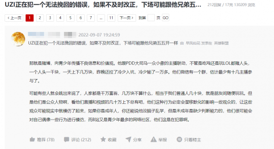在LPL夏季赛结束后,很多主播都重返了日常的游戏内容,这其中也包括了前职业选手Uzi,可让人没想到的是,Uzi居然靠着他之前打职业积累下来的人脉,带头组起了直播红包局,让很多网友开始担忧起他未来的直播生涯。 所谓的红包局,就是主播通过一局游戏的击杀数、阵亡数、胜利与否作为判断条件,让参与者猜测自己的战绩,以便获得或支付红包。举例来说,Uzi在近期曾表示自己能在PUBG中杀入前三,如果他能成功就能获得其他队友支付的红包,反之,他就需要支付给其他主播红包。 对于直播玩红包局这种行为,有网友表示无法理解,因为这种红包局的本质都是“菠菜”,甚至还是在直播平台上当着几十万人在“菠菜”,很容易就会向未成年人传递不良的价值观。所以,他们认为UZI正在犯一个无法挽回的错误,如果不及时改正,下场可能跟他兄弟五五开一样。 对此,很多网友都表示认可:“说实话,如果输赢请吃饭都没啥关系,这种红包局越玩越上头,现在看PDD?天天就想这个,MM和XDD也是,团子都不太敢玩了,劝他们尽早收手,有一天被举报了,下场会和山泥若一样”,“他们就是玩太大了,说真的几十无所谓,物资前天晚上说输了几万呢,冷少昨晚输了一万多”,“确实,私下里玩玩算了,直播还是别搞这种事情”…… 值得一提的是,在各大视频网站上,已经出现了大量Uzi玩红包局的相关录播切片,切实已经对未成年群体产生了一定的影响。而参与热议话题讨论的网友也有部分要去实名制举报Uzi,也不知道是一时间的调侃,也是真去执行了这个操作。 对此,小编也能表示这种红包局还是少开比较好,毕竟一局游戏能赢上几千块,这个诱惑对于成年人来说,都已经是很大了。 编辑:月光下完美
