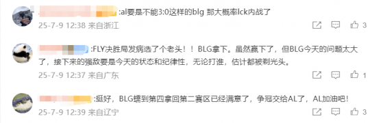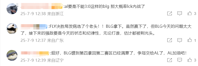 在经过五场鏖战过后,BLG一众选手终于在第五局集体觉醒,以3-2比分战胜FLY晋级到下轮。而这,也意味着LPL赛区的世界排名重新回到第二,解锁今年S赛四号种子的名额。 虽然过程跌宕起伏,但结果是大家想要的。在FLY输掉第五局时,玩家心里悬空的石头终于放下了,但他们对BLG今天的表现极不满意,纷纷开始隔空喊话,希望他们提前订机票,将决赛名额让给AL:“现在最可怕的就是BLG上去把AL打回家,然后又输给LCK”,“下把陪练给AL练体系又立一功”,“争冠交给AL,BLG可以定机票了”…… 尽管BLG在这轮比赛里打得十分吃力,但阿Bin依旧是信心满满,在赛后采访环节更是放出狠话:“不要忘了我在22、23、24年都打进MSI决赛,我觉得这次我们也可以”。 说实话,不狂就不是阿Bin了,网友表示:“这下对味儿了,前面谦虚的让人陌生”,“bin哥,你的信誉分还值得相信么?”,“你就不能忍一会吗?我真的是对这个人极度无语了”…… 客观来说,现在不论是AL还是BLG,他们在打败者组比赛的状态都不太对劲。尤其是圣枪哥、Hope、左手还有On这四位选手的发挥太过于神经刀,一会儿能站起来C全场,一会儿低迷狂送。 至于现在AL跟BLG比起来到底谁更强?现在真不好说,因为两边不稳定的选手并不在一个对位上,或许Bin可以在上路找到突破口,又或许香克斯可以把左手打到没声音,对于双方来说,如何调整状态是取胜的关键。小伙伴们看好哪支队伍进入败者组决赛呢?欢迎在下方留言分享。 编辑:月光下完美