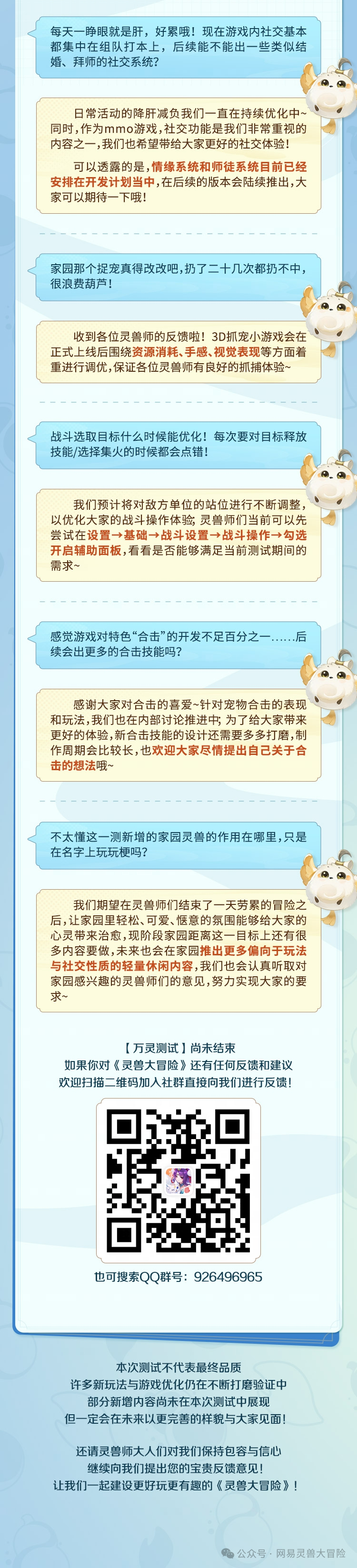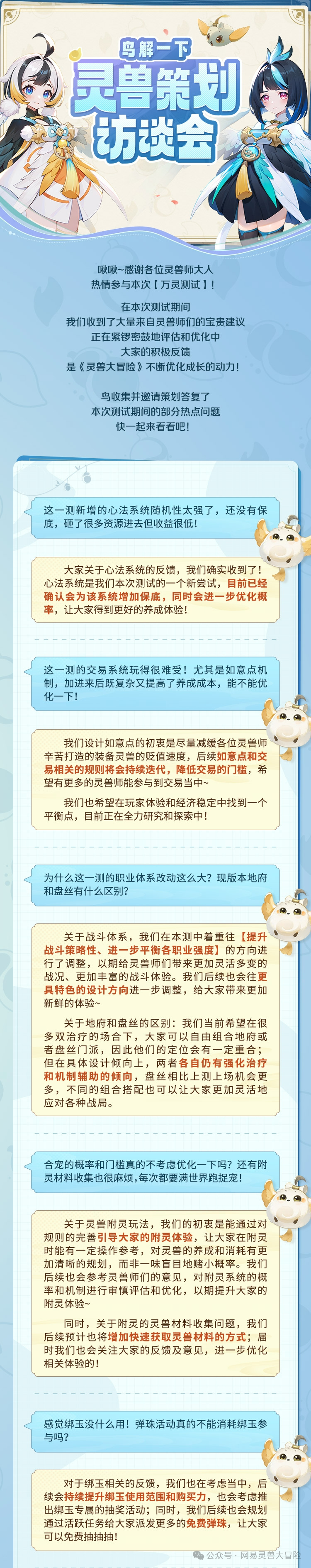 啾啾~感谢各位灵兽师大人 热情参与本次【万灵测试】! 在本次测试期间 鸟收到了来自灵兽师们的 大量宝贵建议 目前正在督促策划 认真评估与调优中! 鸟在此感谢大家的支持 各位的积极反馈是《灵兽大冒险》 不断优化成长的动力! 于此 鸟记录并邀请策划答复了 本次测试期间的部分热点问题 一起来看看吧! 编辑:月光下完美