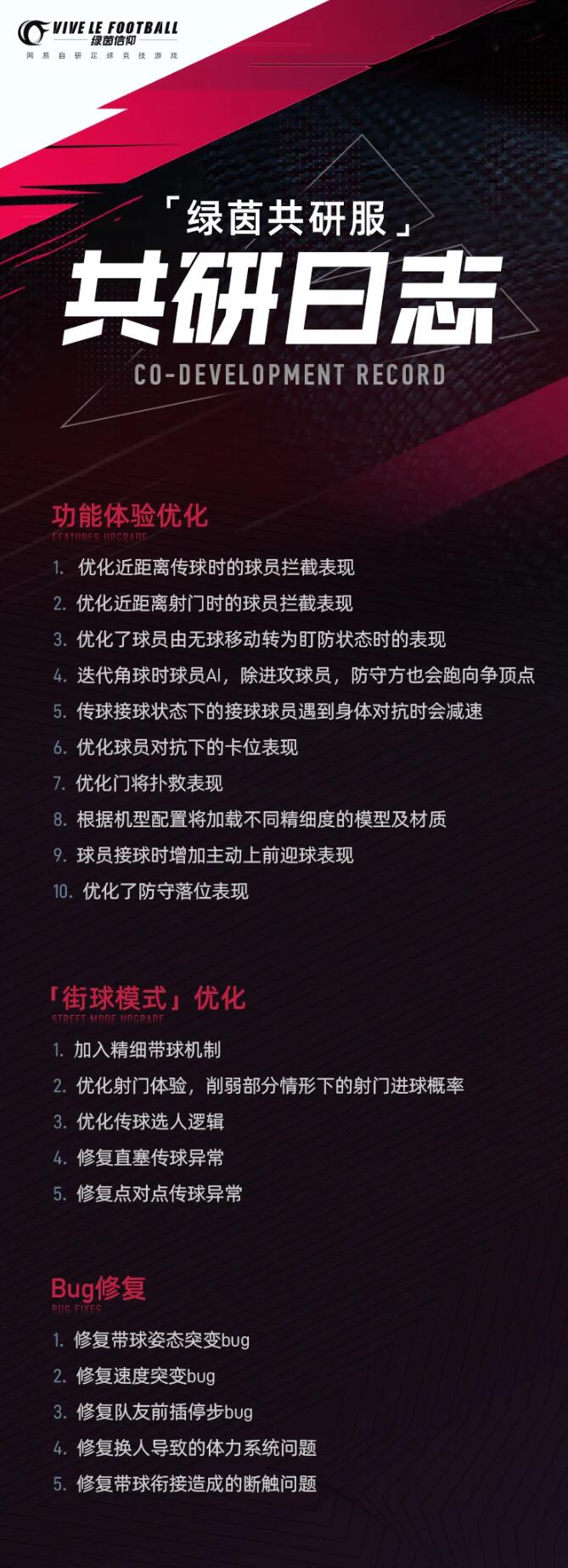早上小助理路过开发组 不禁惊呼一声 几位策划顶着大大的黑眼圈 恹恹地趴在桌上 “你们这是晚上通宵踢球了?” “别提了,因为咱们经理人个个都是人才。” 在小助理的追问之下 才知道竟然是因为「绿茵共研服」 经理人们真诚地提出了很多建议 开发组为了赤诚以待 努力以最快的速度处理了一些问题 跟着小助理看看开发组的共研日志吧 ↓ ↓ ↓