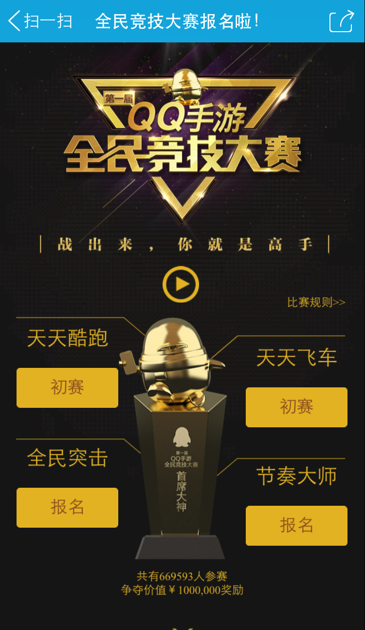 3月20日,由腾讯QQ手游主办、超好玩协办的第一届“QQ手游全民竞技大赛”的报名入口正式开启。据主办方介绍,QQ手游全民竞技大赛是由腾讯QQ推出的面向所有QQ手游玩家的全民级手游电竞赛事,其宗旨是为广大普普通通的QQ手游玩家提供一个专业竞技、全民参与的年轻态平台,一如“战出来,你就是高手”的赛事口号。首届QQ手游全民竞技大赛开启四款手游竞赛项目,即《天天酷跑》《天天飞车》《节奏大师》《全民突击》,赛期历时一个月,冠军之战将在4月19日前后逐鹿于上海。本次赛事将覆盖全国 34个省市亿万用户,几千万玩家参与线上角逐。同时,本次大赛设立有百万奖金池,这在国内手游竞赛领域也算是“壕级”标准。 全民竞技 大神从群众中来 据悉,此次QQ手游全民竞技大赛覆盖全国34个省市、自治区和直辖市,影响人数过亿。目前,大赛报名入口小范围开启,便已有几十万玩家报名,据主办方预测,截至报名终止,可能吸引上千万玩家参与线上角逐,而这次的线上海选人数,有可能成为QQ手游举办过的所有赛事中参与人数最多的一次。 “从QQ手游以往举办的大大小小的赛事数据来看,参加比赛的玩家皆是来自各行各业的普通人,有学生,有白领,也有个体户小老板……而就在这些普通玩家中,潜藏着很多大神级的人物。”赛事相关负责人这样介绍道,也正是因为有了这样的赛事经验和用户洞察,QQ手游才要办一项全民级的手游竞技赛事。 专业赛制 豪华决赛场 据了解,此次大赛全程历时一个月,从海选到半决再到决赛采用晋级制,最终四个比赛项目,将分别产生16、16、8+8(节奏大师分手机组和平板组)、8共计56名选手进入全国总决赛。全国总决赛将在上海松江大学城体育馆举行,场馆可同时容纳千人,决赛当天将通过腾讯视频、触乐网、腾讯游戏频道、 17173等多家游戏媒体进行全网在线直播,超人气游戏解说和专业的手游竞技裁判为比赛坐镇,同时,还将会有线上神秘明星亲临决赛现场为选手们助阵加油。 年轻玩法 热血激情 有数据显示,在QQ的活跃用户中,90后和00后占比达50.3%,年轻用户是绝对主力。主办方表示,手游竞技彰显了年轻人积极进取不服输的精神,QQ手游举办全民竞技大赛,就是想通过热血激情、执着向上的方式,向所有的QQ手游用户传递一种年轻即竞技的正能量。这也是QQ在“年轻”这一品牌理念上一直想向大众传递的信息。 4月19日总决赛将于上海上演,我们翘首以待。 |