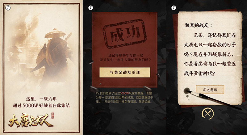网易第一战斗网游手游激情版《大唐无双》App Store即将12月16日独家首发,今日,《大唐无双》手游官方网站和情怀站点率先上线,携热血澎湃的主题视频带着好战玩家重回烽火连天的战斗黄金年代。 【游戏战斗视频曝光 再一次热血激战 】 楼宇亭阁之间飞跃穿梭,如天外飞仙般飘渺绝伦;席卷全屏的酷炫招式下,怒斩破浪般的一将挡千,只在指尖划动。在《大唐无双》手游中,玩家不仅能得到山水林涧的精美感官,更能体会到激情杀戮的快感。 作为强PK战斗的新锐,手游继承了端游核心的PK玩法,将逐步移植端游中超过67种的经典战斗玩法,从1V1的单人竞技场、野外运镖小冲突,到5VS5团队竞技场、15VS15的巴蜀战场,再到40VS40的物资战场,多变的PK玩法让好战玩家可以随时随地在指尖开启各种PVP角逐,重回一战七年的战斗黄金时代。 【预约好战首发,一支“穿云箭”召回老战友】 今日,《大唐无双》手游官网全新上线(dt.163.com),正式开启首发预约活动“让战斗,重返黄金年代”,官方提取了超过5000万端游玩家的历史数据,玩家参与预约活动后不仅能够获得提前福利,更能查看多年的黄金记忆和找回那未曾联系的战友。 如果你不曾了解《大唐无双》,通过预约活动,你可以见证无双多年的数据,感受在这个战场上的热血厮杀。如果你是无双的老玩家,你将有机会查看到自己历年征战的大数据,从初出茅庐的愣头青一路搏杀到登顶巅峰,你所经历过的征程,我们都将为你铭记。而最特别的是,项目组还特别帮玩家找回了亲密好友的数据,也许你跟他已经多年未曾联系,通过H5活动,项目组可以帮忙发送邮件或者短信来召唤黄金战友,等他与你一起携手回归,吹响集结号,再一次战个痛快。 【一战七年热血情怀 重回战斗黄金年代】 《大唐无双》品牌始终秉承为玩家打造最纯正热血的战斗体验的初心,一战七年,积累了千万玩家基数。今日同步上线黄金时代专题页面(dt.163.com/goldenage/),百万总教头的战鼓和玲珑小师妹的面具,将老玩家带回那个战斗的黄金时代,即将迈入七年的从《大唐无双》到《大唐无双》手游,所增加的并不是两个简单的词缀,而是沉甸甸的记忆和情怀。 两千多个日夜,我们从孤身一人到肝胆相照,依然不变的是那份好战不止的豪情,这是属于我们的战斗黄金时代,大唐无双记录了我们,而我们记录了一个时代,每个人的好战热血中,都有那个战斗的黄金时代。 了解更多相关信息,请前往http://sy.yzz.cn/dtws/ 编辑:Astory
