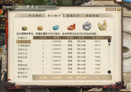 火热的4月PK季之后,《大话西游2免费版》玩家的PK热情不仅未有丝毫退减,反而更加高涨。为了让大家能够更加酣畅淋漓地战斗,聚武台玩法将在PK季结束后接力推出,持续延烧,燃爆整年! 聚武台玩法详解 热血PK不容错过 在活动周期中,完成聚武台中指定的玩法即可获得对应的武道积分,每个活动周期结束,将根据武道积分总分排行榜的名次,颁发对应的队伍站台饰品奖励。 同时,武道积分亦可用于兑换奖励,未兑换的积分不会在活动周期结束时清空。 图 1 1.活动周期:以季度为单位,一个季度3个月为一个活动周期(4月因开放PK季玩法,故夏季的活动周期为5-6月)。 2.涵盖内容:天梯比武、天梯巅峰战、召唤兽比斗、跨服比斗、种族比武、水陆大会、帮战(含跨服)、比武大会、跨服夺岛、烽火连城。活动周期内完成以上任务皆可获得相应的积分。 3.积分细则: 玩法 武道积分说明 天梯比武 武道积分=活动期间获得天梯积分*10(此积分为天梯奖励积分) 天梯巅峰战 根据赛事获得对应武道积分: 预选赛:参加次数(胜)*100分;参加次数(败)*50分;弃权0分 总决赛:冠军1500分,亚军1200分,四强1000分,八强800分,三十二强650分,六十四强500分 水陆大会 武道积分=活动期间增加的水陆大会积分等值*2 比武大会 根据赛事获得对应武道积分: 单服16强150分,单服8强300分,4强400分,虎队450分,龙队500分; 甲组冠军1500分,亚军1200分,四强1000分,八强800分,三十二强600分; 乙组冠军1000分,亚军800分,四强600分,八强500分,三十二强400分; 种族比武 根据赛事排名获得对应武道积分: 循环赛排名: 第1名400,第2名380,第3名360,第4名340,5-8名320,9-16名300,17-32名280,33-64名260,65-128名240,129-1000名以后220 巅峰赛排名: 第1名400,第2名380,第3名360,第4名340,5-8名320,9-16名300,17-32名280 跨服赛排名: 第1名400,第2名380,第3-4名360,5-8名320,9-16名300,17-32名280,33-64名260,65-128名240,129-1000名以后220 帮战(含跨服) 武道积分=获得战功*2(帮战当天上限400武道积分,即当天2场帮战获得的积分上限为400) 跨服夺岛 武道积分=获得积分/2 召唤兽比斗 武道积分=获得比斗积分/3 跨服比斗 武道积分=获得跨服比斗积分*4 烽火连城 武道积分=获得军功*2 4.活动奖励:活动周期结束后,根据武道总分排名,自动颁发对应的队伍站台饰品(有效期持续至下一个活动周期),同时活动期间活动的武道积分,可用于兑换物品奖励。 站台饰品名称 颜色 武道积分排名 金耀 前20名 银辉 21-100名 赤火 101-300名 蓝玉 301-600名 琥珀 601-1000名 青竹 1001之后 燃情西游,火爆江湖!《大话西游2 免费版》聚武台玩法更多福利更多挑战,邀你超越自我,精益求精! 《大话西游2经典版》,国风经典,亿万口碑扛鼎之作!官网:http://xy2.163.com/ 《大话西游2免费版》,绿色免费,轻松赚钱,经典再临!官网:http://dh2.163.com/ 《大话西游2口袋版》,满分经典,指尖还原!官网:http://xy2.163.com/koudai/ 编辑:叶子猪小秘书