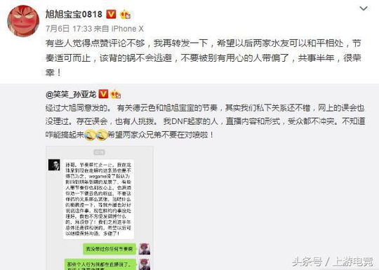 1 但是舆论却不仅在于换平台,有关德云色和旭旭宝宝的节奏也开始流传,笑笑发文称:其实我和旭旭宝宝私下关系还不错,我是DNF起家的人,直播内容和形式、受众都不冲突,不知道咋能搞起来 而旭旭宝宝也回应:希望两家水友和平相处,不要被备有用心的人带偏了