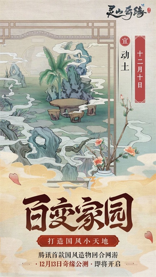 腾讯首款国风造物回合网游《灵山奇缘》将于12月13日迎来奇缘公测,全新缘份玩法将抱团来袭。继百变灵兽、情缘婚姻全面曝光之后,今日,《灵山奇缘》奇缘公测最后一个神秘玩法——家园系统正式揭秘。玩家可以在奇缘公测全新概念站内抢先体验家园房屋装扮玩法,更有诸多家园玩法的细节体验也会在今日一并揭晓。 奇缘公测概念站:https://huihe.qq.com/cp/a20181107qygc/index.htm 第三张奇缘海报 第三张奇缘海报发布 今日“宜·动土” 今日,《灵山奇缘》最后一张奇缘海报正式发布,百变家园“宜·动土”。家园海报延续奇缘海报系列一贯的中式古风挂历形式,手绘出了“雕花窗,圆拱门,青石小径雾如纱;一石桌,三两凳,嶙峋奇石腊梅花”的中式传统园林之美。家园,家园,既有家又有园,《灵山奇缘》中的家园正是将房屋和庭院结合在一起呈现在玩家面前,玩家可以根据自己想要的风格去装饰和构建家园,打造专属自己的小窝。 奇缘公测概念站抢先体验 家园系统即将上线 多重风格自由组合 家园系统将在奇缘公测中正式和大家见面,玩家可以拥有一个温馨的小窝和一个休闲的庭院。在已经上线的《灵山奇缘》奇缘站中,玩家可以抢先体验家园玩法,去自由装修自己的家。全面曝光的家园系统,不仅有可以自定义的“家”,还有可休闲的“园”。 家园装饰设计稿 家园装饰设计稿 家园装饰设计稿 玩家拥有的家可以不断升级外观,从“茅屋小舍”到“豪华别墅”,家里能摆放各种风格的家具,并且可以根据自己的喜好去选择家具摆放的位置等。用于休闲的庭院园林,有着广阔的空间让玩家自由去建设,圆石桌圆石凳,方石桌方石凳,照明路灯和奇景盆栽等,都可以随意摆放。此外,在庭院中,玩家还能体验“采菊东篱下”的悠然生活,去种植各色农作物,还能养宠逗乐逍遥游玩等。 庭院种植 养宠逗乐 12月13日奇缘公测 缘份玩法全面开启 《灵山奇缘》12月13日正式启动奇缘公测,全新的缘份社交玩法将全面呈现。遇缘灵兽,灵兽玩法升级,开启灵兽属性全面强化新时代;婚姻系统,让有情玩家终成眷属,迈向千里相随、坐骑同乘时代;家园玩法,让玩家可以自由打造休闲居住之所,《灵山奇缘》多元社交玩法即将揭开新篇章,更多精彩尽在即将到来的奇缘公测! 《灵山奇缘》12月13日奇缘公测 12月13日《灵山奇缘》奇缘公测启动,今日最后一张奇缘海报曝光,家园玩法全面揭秘,百变家园,打造专属玩家自己的国风小天地。 《灵山奇缘》——这一回合,万物生灵 《灵山奇缘》官方网站:http://huihe.qq.com/ 《灵山奇缘》官方论坛:http://huihe.gamebbs.qq.com/forum.php 《灵山奇缘》积分社区:http://huihe.qq.com/jifen/ 关于腾讯游戏 腾讯游戏,全球领先的游戏开发和运营机构,国内最大的网络游戏社区。以“用心创造快乐”的理念,腾讯游戏通过在多个产品细分领域的耕耘,对多元化四大平台的打造,致力为玩家提供“值得信赖的”、“快乐的”和“专业的”互动娱乐体验。 腾讯游戏,用心创造快乐! 了解更多相关信息,请前往http://news.yzz.cn/gamelsqy/ 编辑:叶子猪小秘书