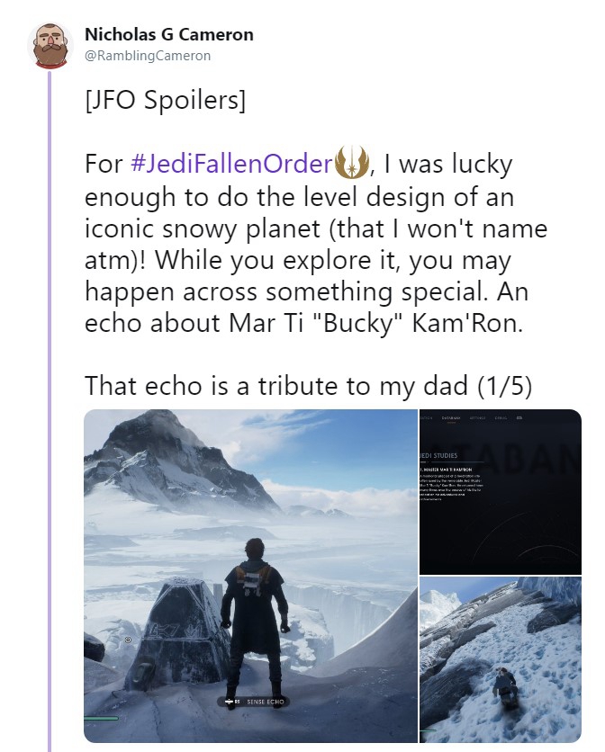 《星球大战绝地:陨落的武士团》作为EA“星战”系列的最新作品,Respawn可以说漂亮地为其星战系列打了一个翻身仗。在玩家们为游戏注入情怀的时候,游戏的关卡设计师Nicholas Cameron也把自己的情怀带入到了游戏之中,他在游戏中专门制作了一个回想纪念自己父亲。 《星球大战绝地:陨落的武士团》关卡设计师Nicholas Cameron在推特中称,自己很荣幸为游戏设计了一个遍布大雪的星球,当玩家们探索的时候,你会发现一些特殊的东西,比如一个关于Mar Ti "Bucky" Kam'Ron的回想,没错那描述的就是我父亲。 游戏中的“回想”是关于游戏中一些特殊片段的回忆,关卡设计师Nicholas Cameron便把自己的父亲Martin Cameron加入到了回想之中,把自己的父亲写成了一个绝地大师。 儿子Nicholas Cameron(右)和父亲Martin Cameron(左) 而关于自己的父亲,Nicholas Cameron在推特中也描述到,爸爸也是一位游戏设计师,为大量的游戏做过3D建模,而自己也是受了父亲的影响踏入了游戏行业,可以说是子承父业。 而在自己制作了《星球大战绝地:陨落的武士团》的关卡之后,Nicholas Cameron与父亲的联系更加紧密了,自己的父亲也曾为大量的“星战”游戏做过3D建模,可以说父子联系更加紧密了。Nicholas Cameron的父亲在一年前去世,老人家看到儿子能做出《星球大战绝地:陨落的武士团》这样优秀的游戏,应该也会很欣慰吧! 编辑:叶子猪小秘书