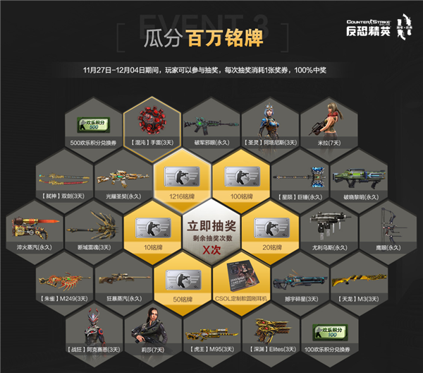 随着12月份的临近,《反恐精英Online》十一周年的各种预热福利活动终于要陆续开始了!11月27日,“十一周年大回馈 瓜分百万铭牌”活动率先来袭,分享活动专属链接,或是在游戏中前三次任意消费,都有机会抽取铭牌大奖,以及各种实物外设和稀有武器道具好礼,机会难得,大家千万不要错过哦! 瓜分百万铭牌 奖池分布 首先,相信大家都非常好奇,奖池中到底有什么呢? 11月27日-12月04日期间,玩家凭借参与活动获得的抽奖次数可以在奖池中参与抽奖,每次抽奖消耗1张奖券,100%中奖。奖池中除了包含不错的游戏内道具和外设奖励外,还有大量的高额度铭牌奖励!有了铭牌就可以在游戏中任意购买各种你想要的武器道具了。这次为回馈玩家,特别在奖池中注入百万铭牌供大家抽取,抽到铭牌奖励的概率非常高哦!大家可千万要抓住机会了! 抽奖券获取途径一 诚意分享送奖券 2019年11月27日至2019年12月03日,活动期间玩家可在活动页分享本活动的专属链接,当链接页面浏览次数大于等于3次即可领取一张抽奖券。参与到接下来的铭牌稀有道具大抽奖中了。 抽奖券获取途径二 消费返利领奖券 2019年11月27日至2019年12月03日,活动期间玩家在游戏商城内消耗任意铭牌数量,即可领取一张抽奖券,最多可获得三次。值得大家注意的是,消耗铭牌数量仅计算消耗总次数,不限制单次消耗的额度哦!也就是说,不管你单次消耗了多少铭牌,只要有消耗记录都会被列入计算。 以上便是《反恐精英Online》11月27日开始的十一周年专题活动“瓜分百万铭牌”的最新预告了,不知道大家是否都已经迫不及待了呢?在后续还将有更多的十一周年专题活动在等待着大家,各种形式的福利好礼送不停!欢迎大家多多期待! 编辑:叶子猪小秘书