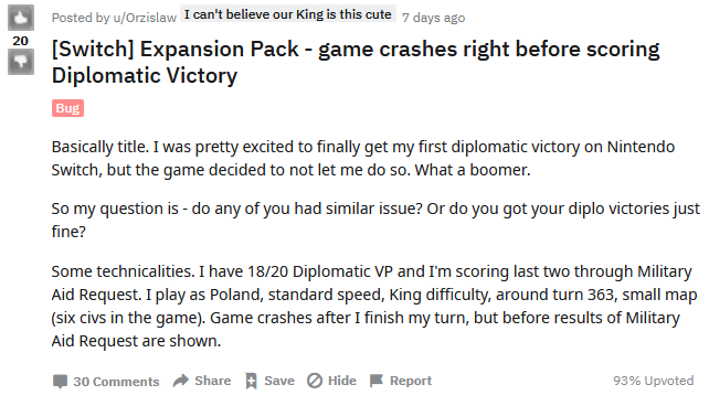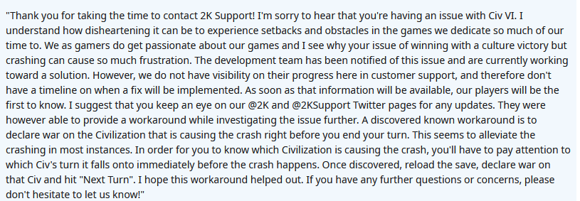 近日,一些玩家在Reddit上曝出了NS版《文明6》近日出现的一些“令人有些哭笑不得”的问题,那就是:玩家在正式宣布胜利之前,游戏会出现崩溃问题,网友“Throwaway489er”目前在reddit上贴出了官方给出的一种“非常古怪”的解决方案:在胜利前的一回合对其他文明宣战。 一位玩家在Reddit上表示:“当我想在任天堂Switch版《文明6》中实现外交胜利时,游戏会出现崩溃问题,感觉就像系统并不想看到我以这种方式取得胜利。”另外一些玩家也在这篇帖子下提到了同样的问题:科技、文化胜利也会出现相同的崩溃问题。 很多玩家向2K寻求帮助,同时也将此次游戏崩溃问题进行了详细汇报。目前,玩家“Throwaway489er”在2K客服的回复中找到了一种应急方案,那就是:首先重新加载存档,然后在科技、文化等胜利前对其他文明宣战,之后再点击下一回合按钮进入胜利结算页面。这种方法目前仅仅用于应急,可以减少崩溃出现的几率。 此外,官方目前已经针对NS版《文明6》展开修复,至于未来会有怎样的结果,还请继续关注我们的报道。 编辑:叶子猪小秘书