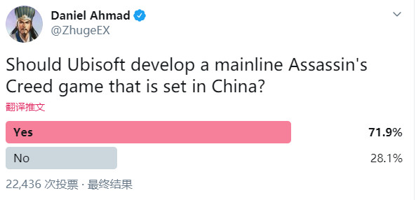 近日知名分析师Daniel Ahmad在Twitter上做了一个小调查,主题是“育碧是否应当推出一个以中国为背景的《刺客信条》正传游戏”。这次调查吸引了2.2万人投票,结果显示超过70%的国外玩家表示同意,只有28.1%的玩家不同意。 消息发布后,国外网友认为,尽管中国背景的《刺客信条》很令人兴奋和期待,但国内严格的审查,很有可能会让育碧打消这一念头。 也有人认为如果育碧推出中国版《刺客信条》,那么这意味着日本背景的AC就没希望了,因为如果二者都做的话,那么这两个游戏在审美上可能会比较相似。 网友:Shao Jun值得被对待更好,而不是那个横版闯关的《刺客信条编年史:中国》。 网友:何不来个东亚三部曲:中国,日本和蒙古 网友:更想先看到一个日本背景的《刺客信条》,因为现在已经有了一个中国背景的AC,只不过不是正传。 网友:很多人希望是三国背景,但如果不忽略很多历史的话,这个时代很难有太好效果。更希望是设定在唐朝。 值得一提的是,育碧最近公布了以中国背景的原创漫画《刺客信条:王朝》,8月26日正式上线。 编辑:月光下完美