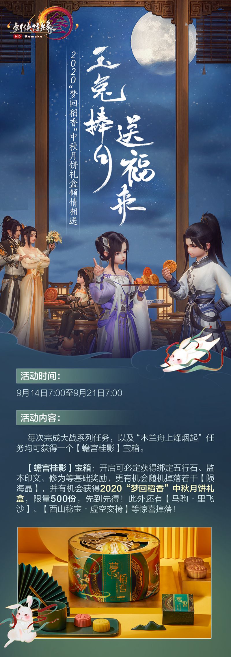 天地蒙晦,乱劫将至,《剑网3》年度资料“奉天证道”9月15日(即明日)即将登录测试服,神秘莫测的全新门派衍天宗惊世登场,以天道为任又将如何化劫?还有全新110级大战系列5人秘境等你抢先体验!此外,衍天宗技能演示直播今日17:30与你相约直播间,想要抢先一窥新门派衍天宗武学奥秘的侠士可千万不要错过! 而首批测试服体验资格也将在今日13:00至13:30发放!本次测试将清空此前所有测试资格,所有账号需重新激活测试资格才可登录测试服进行体验。本次测试资格申请依旧沿用不拼手速的申请模式,侠士只需登录申请界面,点击申请即可参与,《剑网3》将会根据侠士账号近期的活跃度进行排序,前5,000名侠士即可获得首批测试服体验资格。值得一提的是,本次测试资格官网申请页面将不再发放激活码,成功申请测试资格的账号将直接激活测试服资格,抢先开启全新体验! 与此同时,金秋团圆“中秋盛典”也将于9月17日盛大开启!月明故乡,桂香萦绕,诸多精美豪礼亮相,伴你共度中秋佳节温情团圆夜!值此佳节之际,我们的老朋友林白轩与苏雨鸾正浓情蜜意,却被谢长安从中作梗,令苏雨鸾又惊又怒,究竟林白轩能否追回自己心爱之人?且看中秋主题纪念大片《人间入味清风调》! 中秋主题纪念大片《人间入味清风调》首映: 看完视频想必侠士们已经发现了不少彩蛋,那么就由资讯君为大家隆重介绍,月明秋思主题礼盒“望舒撩月”惊喜亮相,还有经典复刻“远山雪”、“望月”令人心动不已!此外还有全新金发“卷烟霞”与全新充消活动奖励昨日也抢先曝光,而全新佩囊“绒花结”与玉兔主题脚印特效面部挂件“玉兔假面”、“火兔假面”给你趣味体验!更有星象主题家具礼盒“天机万象”为侠士的家园增添神秘与梦幻之感!诸多豪礼登场,伴你共度中秋! 【月明秋思情意绵绵 全新外装礼盒四款偏色任君选择】 本次外装礼盒“望舒撩月”以盛唐时期贵胄着装风格为参考,并在此基础上增添贵族气质,给人以温文尔雅的世家风范。值得一提的是,本次月明秋思主题礼盒“望舒撩月”均包含四款偏色以供侠士选购,款式典雅,颇具大气。 成男款儒雅贵气,布料考究款式端庄,细节处更见其精致。丝质薄纱环肩而绕,宛若仙家风骨,又似月光凝就,垂至手臂与两袖齐飘散,更显仙韵雅致。衣摆处精致绣纹,暖玉生烟萦绕明月间,云雾缥缈似仲秋夜空,搭配薄纱掩映,如月光朦胧,更有高束发冠配以烟状发饰凸显文雅气度。 成女款柔美温婉,修身得体,举手投足间皆是贵气。衣衫绣纹精致,云烟袅袅,如月皎皎,两袖牡丹绣纹搭配金饰相坠,旱金莲朵朵随袖摆动,宛若月中仙人,又是人间绝美。领口设计更为绝妙,素花灿烂,玉烟弥散,薄纱掩映,更觉菀菀!发式则选用古典发髻并加以修饰,辅以金饰点缀,玉簪配花,自是秀丽端庄之美! 萝莉款颇具生趣,娇俏灵动,给人以活泼之感。薄纱裹肩,两袖随风自起,自是柔美之意。颈畔花饰点缀,增添温婉之感,衣着绣纹玉烟缥缈,意韵朦胧,仙韵萦萦。发式则以凸显孩童生趣与活力的双丫髻为原型,并增添独特元素。耳后两朵花饰将小姑娘活泼的童真童趣彰显得淋漓尽致,两股发辫更给人以童稚可爱之意。 正太款则以玉冠束发,叶状金饰点缀于发梢。周身绣纹繁复多样,牡丹雍容绣于两袖,胸前木芙蓉栩栩如生,更有旱金莲状金饰细垂,于点滴处彰显高雅贵气。广口袖配以金丝绣烟纹,在薄纱掩映下更显朦胧。衣摆处玉烟飘散,圆玉镶金如明月,月明秋思正如是! 当然,本次礼盒外装更带全新舞蹈动作特效!开启特效后侠士翩翩起舞,明月徐徐升起,在圆月映衬下侠士的舞姿更显朦胧柔美。同时,本次礼盒还附赠特效团扇背部挂件【仲秋之夜】,扇面明月如玉,烟云缥缈。开启特效后侠士持扇轻舞,波光点点,皓月当空,月下佳人一舞动人,流星散落似满天星雨,别有一番韵味! 【剧情预热开启新阶段 精美福利裹肩披风全民可得】 与此同时,年度资料片“奉天证道”剧情预热活动也步入新阶段!天生异象,谣言、谶语流行于坊间。天劫将至,全新日常任务“天现异象”也随之开启。今日维护后侠士可前往扬州“蒋金鳞”处接取起始任务“天现异象”,每日完成包括“击杀鳄鱼”、“驱赶乌鸦”、“清理石碑”在内的随机日常任务后,即可获得道具【飞星】1枚及【书契】2个,集齐4枚【飞星】道具即可将3200品的“天劫”系列项链提升至3400品! 此外,全新预热福利活动“仗剑江湖·明察幽隐”今日揭幕,精美披风“明察幽隐”贴合裹肩,全民皆可获得!今日维护后直至新资料片“奉天证道”公测前,侠士参与活动完成指定任务或达成目标即可获得专属道具【书契】,集齐688个【书契】便可前往扬州主城活动区寻找“蒋金麟”兑换披风“明察幽隐”!还等什么?赶快参与其中领取精美披风奖励吧! 【暖心仲秋福运绵长 月饼礼盒惊喜相送】 同时,中秋温馨活动“玉兔捧月送福来 ”今日也同步开启,2020“梦回稻香”中秋月饼礼盒相送有缘人!今日维护后至9月21日7:00期间,侠士每次完成大战系列任务,以及“木兰舟上烽烟起”任务均可获得一个【蟾宫桂影】宝箱。开启宝箱不仅可必定获得绑定五行石、监本印文、修为等基础奖励,更有机会随机掉落若干【陨海晶】,以及2020“梦回稻香”中秋月饼礼盒惊喜掉落,限量500份,先到先得!此外还有机会获得【马驹·里飞沙】、【西山秘宝·虚空交椅】等