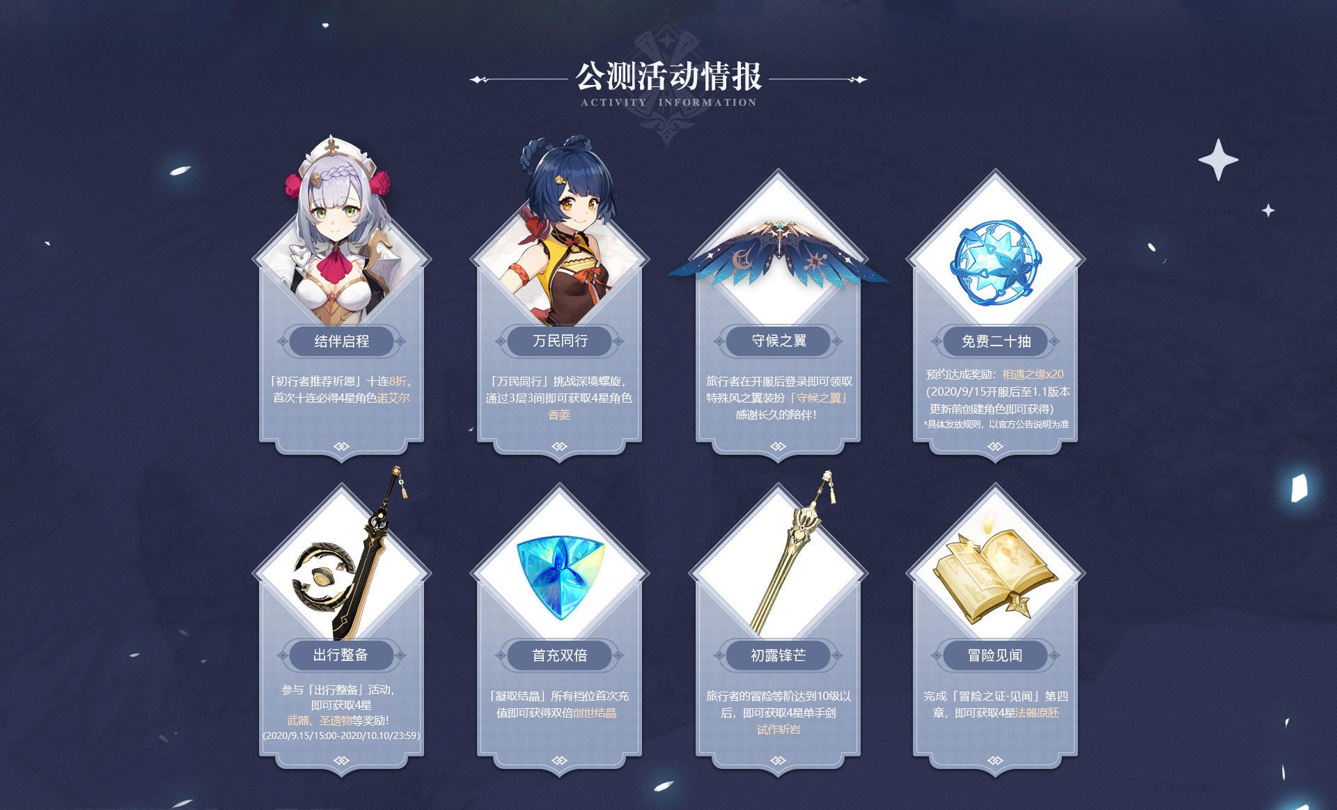 无数生灵繁衍聚集的广袤大陆「提瓦特」,天地万象蕴含其间。这里是七神统治、七种元素交汇的世界......米哈游自研的开放世界冒险游戏《原神》,已于今日上午10点迎来PC版技术性开放测试(不删档)。 PC版技术性开放测试(不删档)今日开启 旅行者可以登录《原神》官网,点击「PC端下载」获取游戏,使用米哈游通行证或TapTap账号均可登录官方服务器-天空岛服。《原神》全球同步公测(PS4、iOS、Android、PC)也将于9月28日正式开启,届时PC端与移动端数据互通。一起伴随主题PV「珍珠之歌」,踏上属于自己的探索之旅吧! 【八大开服活动 助力冒险启程】 为答谢旅行者们的关注与支持,《原神》推出了多项开服活动,希望各位旅行者在踏入提瓦特大陆时,有称心的装备物资来陪伴大家开启冒险。 结伴启程:「初行者推荐祈愿」十连8折,首次十连必得4星角色诺艾尔。 万民同行:挑战深境螺旋,通过3层3间即可获取4星角色香菱。 守候之翼:旅行者在开服后登录即可领取特殊风之翼装扮「守候之翼」。 免费二十抽:预约达成奖励:相遇之缘x20(2020年9月15日开服后至1.1版本更新前创建角色即可获得;具体发放规则,以官方公告说明为准)。 出行整备:参与预抽卡活动,有机会获取4星武器、圣遗物等奖励。奖励兑换将于15日下午15:00开启。 首充双倍:「凝取结晶」所有档位首次充值即可获得双倍创世结晶。 初露锋芒:旅行者的冒险等阶达到10级以后,即可获取4星单手剑试做斩岩。 冒险见闻:完成「冒险之证·见闻」第四章,即可获取4星法器原胚。 开服活动助力冒险启程 【1.0版本新内容 探索更多乐趣】 除开服活动外,《原神》1.0版本还将有许多新内容:「失落的历史」系列任务,将从侧面讲述提瓦特大陆的背景故事,并为解开谜题的旅行者献上丰厚的回报;四位新角色也将加入冒险旅途——神秘的占星术士莫娜、西风骑士团炼金术士砂糖、不卜庐采药人七七以及「璃月七星」中的玉衡星刻晴;愚人众先遣队、幼岩龙蜥、骗骗花、爆炎树、纯水精灵等全新怪物,将带来更多样化的战斗乐趣;拍摄功能与成就系统,帮助旅行者记录每个难忘的瞬间。 神秘占星术士 莫娜 西风骑士团炼金术士 砂糖 不卜庐采药人 七七 璃月七星-玉衡星 刻晴 新怪物:愚人众先遣队 《原神》是米哈游首款支持多端数据互通的游戏,9月28日全球同步公测(PS4、iOS、Android、PC)后,旅行者可以自由进行移动端与PC端的登录切换,选择自己喜欢的平台和设备畅玩这部作品。同时《原神》也支持多平台互联,届时旅行者可以随时随地用手机与伙伴联机游玩,也可与使用PC或PS4的其他旅行者结成队伍共同展开冒险。 七国、万象、众生,跨越尘世的探索之旅,即将启程! 编辑:月光下完美