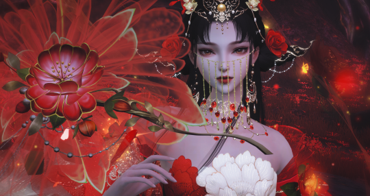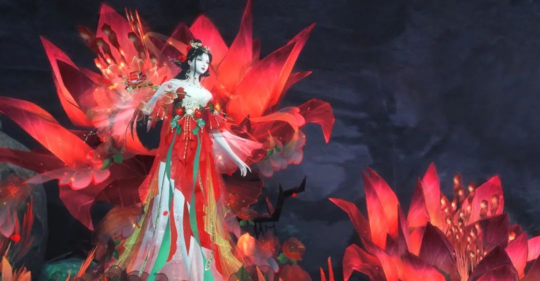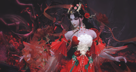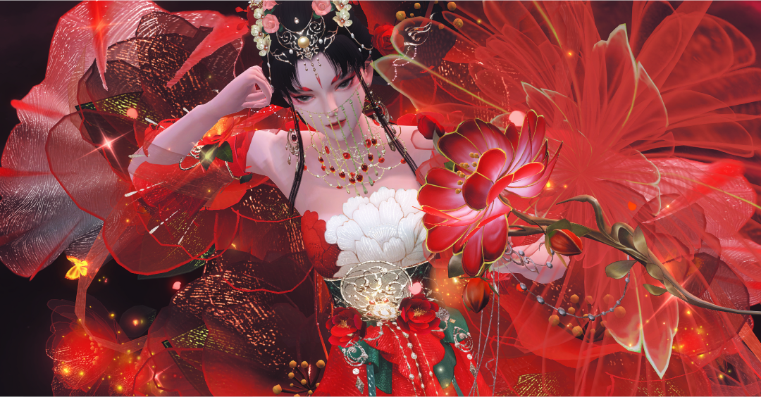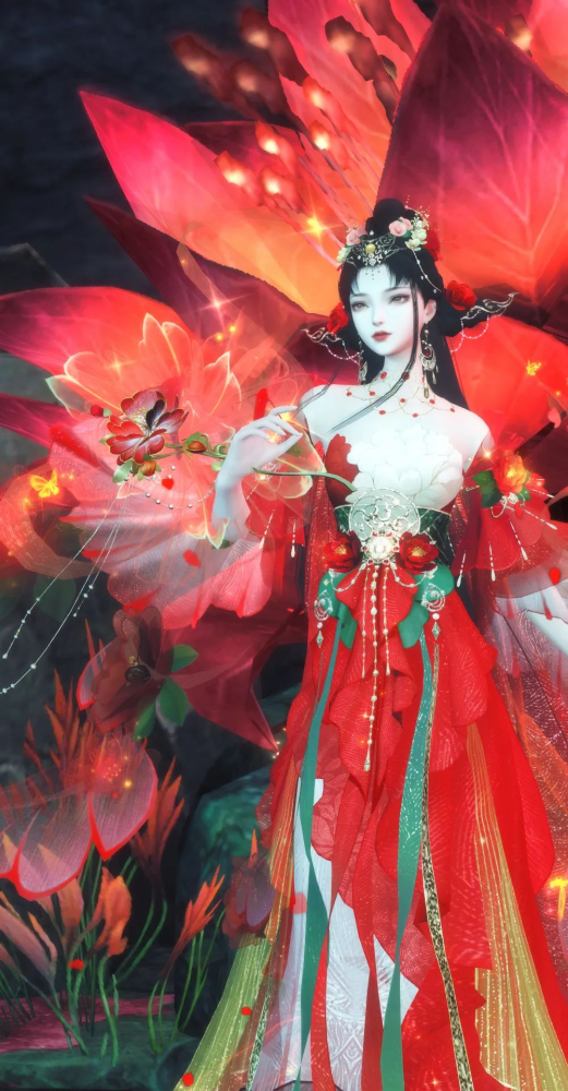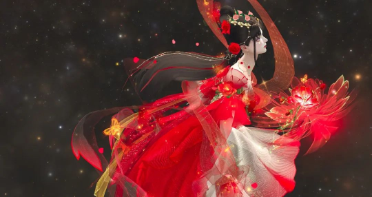 一枝红艳露凝香,云雨巫山枉断肠,缥缈绶带翩扬,黄蝶萦回寻芳。那一抹明媚似火的身影,于浩浩虚空星辰中更为夺目。如烟层叠缎纱璀错缠身,清雅荼白交织烈烈正红,好似正值花期的山茶怒放。腰间墨绿绸锦织配金丝,煌煌圆盘镶以赤宝,垂坠琉璃珠串玎玲作响,奢靡华美。佳人将胭脂涂匀,更施朱粉,道道珠链拂面却无法隐蔽玉颜。她轻抬皓腕,手中海榴之柄光影旎旎,只叹以花结魂之神女落凡,貌惹群芳妒。