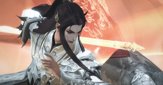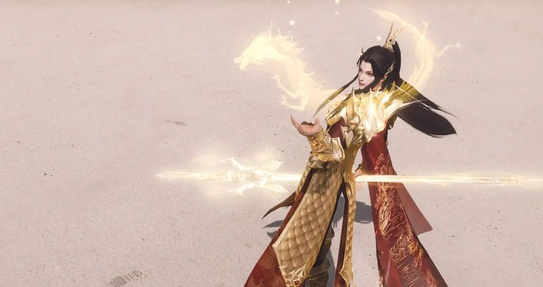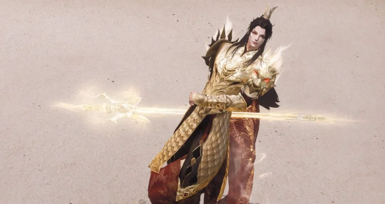 蛰龙已惊眠,一啸动千山,少年披挂黄金甲,片片鳞型凸起密布半身,锐利无匹。肩头胸口尽做凶狠兽首装饰,道道斜出尖刺狰狞威猛,眼窝内嵌丹朱辉石,流光不定,仿若赋予冰冷凶兽以魂魄,又如唤醒蛰伏许久之神龙。将军振臂一举,通体璨金的虚渺龙魂应势而出,盘旋不止,缓缓吐息之间,恫吓万千宵小。