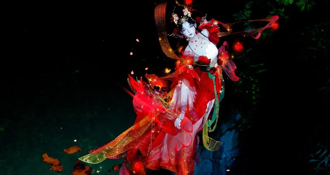 凤箫声绝沉孤雁,望断清波无双鲤,岁月摩挲过色彩已显斑驳壁画,却并未带走女子惊世之娇颜。影翳沉浮,光线黯淡,【阑珊赤鲤】那煌煌莲灯燃起,赤色丝弦交错钩织,只为承托自古迹中再生之画灵。
