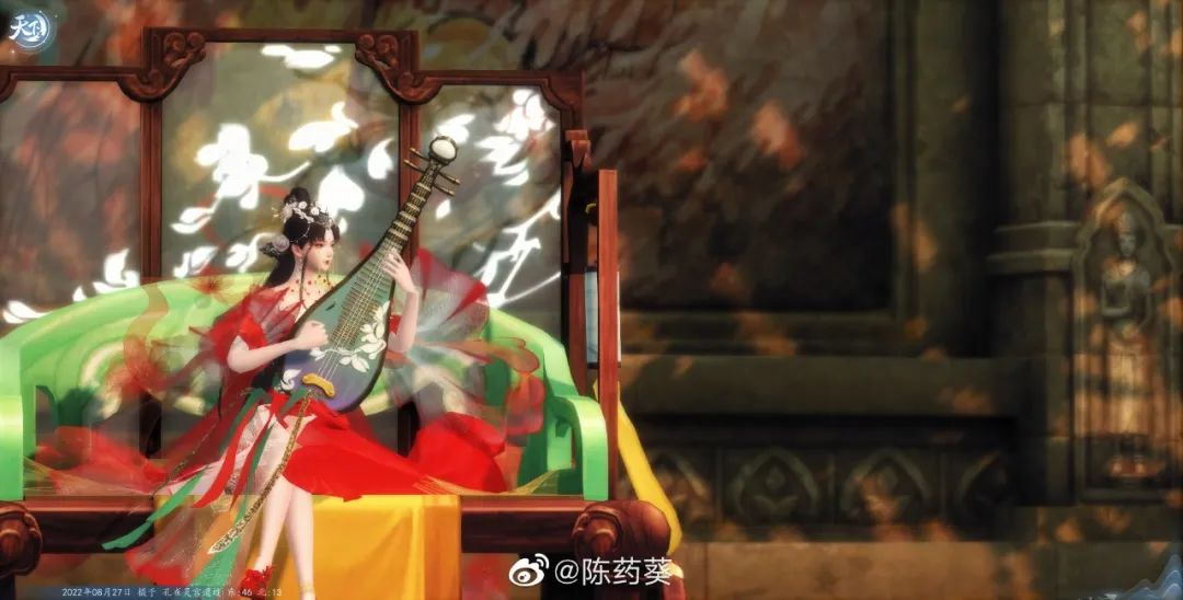 少女曼倚翠玉宝座【沉香椅梧】,晕晕浅辉于绿叶隙间逃出,点亮了脸模【黄梅名伶】上一双剪水秋瞳,佳人素手拨奏琵琶,语笑阑珊间,皆是风情。