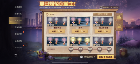 夏日烟花你做主!活动期间每周一到周五,营地市长可在活动页面发起烟花定制提案,并拉取选票赢取烟花大会冠名权;周末晚18点-24点,将按最热门的烟花提案举行烟花大会。幸存者们参加烟花大会,更有随机礼盒、服装租赁、任务奖励等多重福利。快邀上你的心动对象,共赴这场废土世界难得的夏日烟火盛会吧!