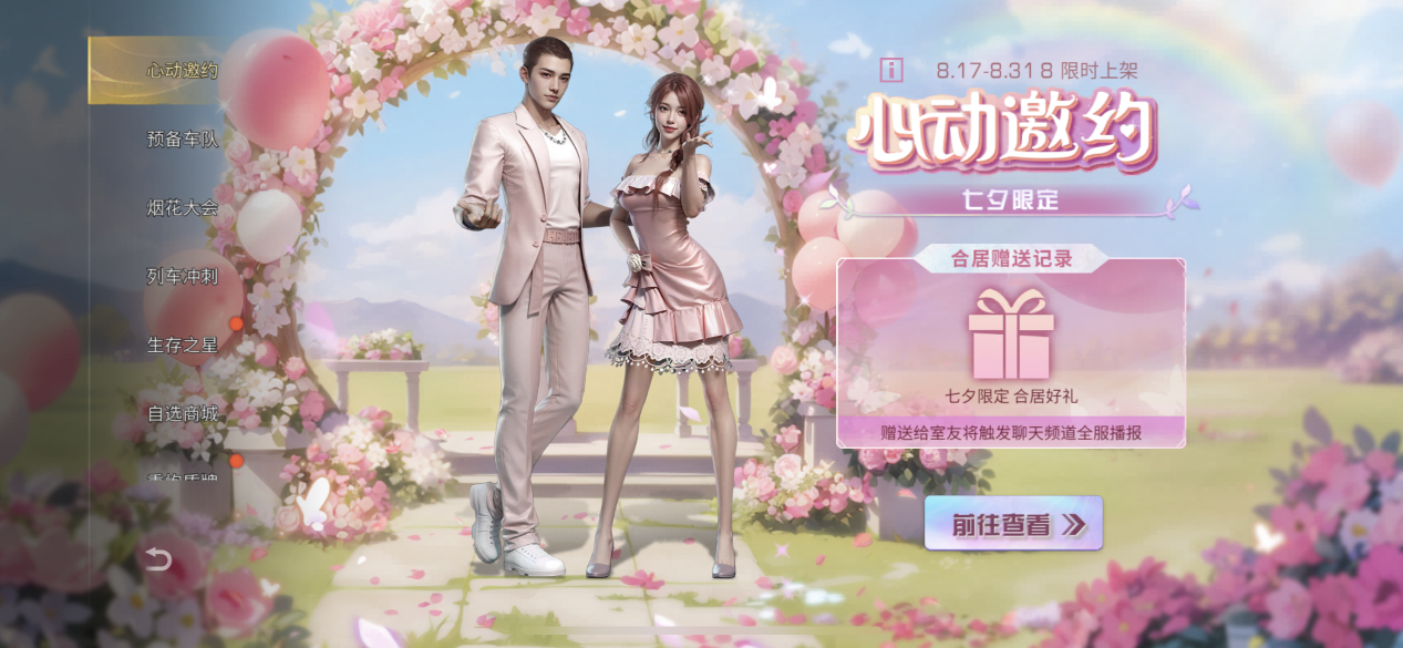 心动是只有自己知道的秘密,爱意是要告诉全世界的欢喜。8月17日至8月31日8点,七夕限定时装【心动邀约】限时上架。为自己和同居一起购买时装后,将触发聊天频道全服播报的特殊祝福。故事,将从这次勇敢邀约开启。