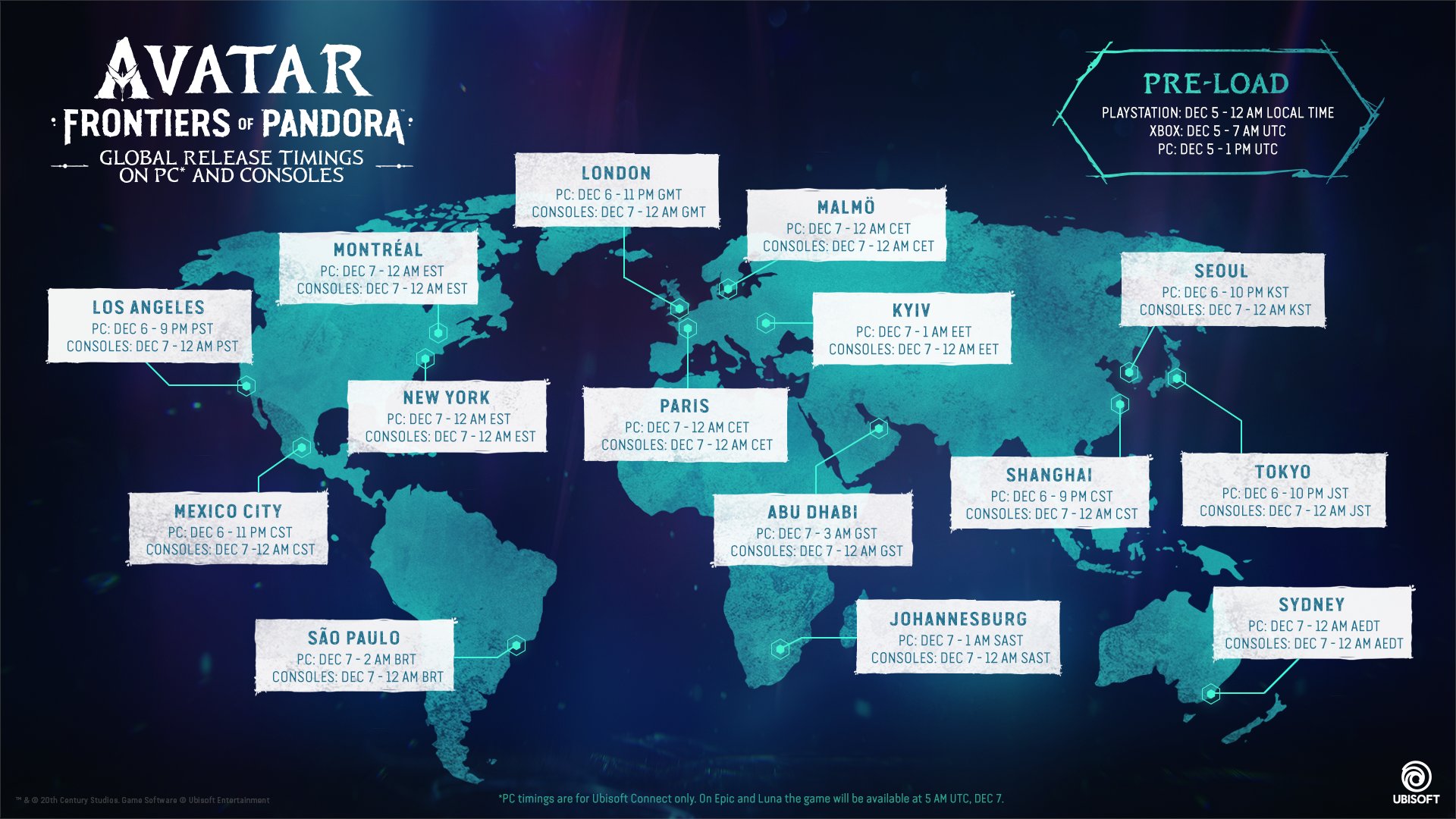 今日(12月5日),育碧公布了《阿凡达:潘多拉边境》的各平台全球具体解锁时间,PC版将在12月6日晚上9点解锁、主机版将在12月7日0点解锁。