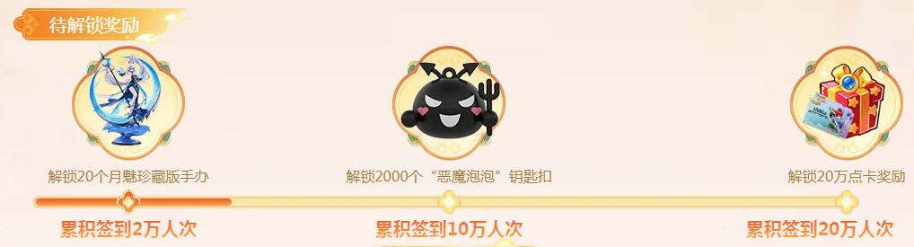 ¡¡¡¡Ôڻ½çÃæÀÛ¼ÆÇ©µ½2ÍòÈ˴Σ¬¾ÍÄܽâËø20¸öÔÂ÷ÈÕ䲨°æÊְ죻ÀÛ¼ÆÇ©µ½10ÍòÈ˴Σ¬½âËø200¸ö¡°¶ñħÅÝÅÝ¡±Ô¿³×¿Û£»ÀÛ¼ÆÇ©µ½20ÍòÈ˴Σ¬½âËø20Íòµã¿¨½±Àø¡£