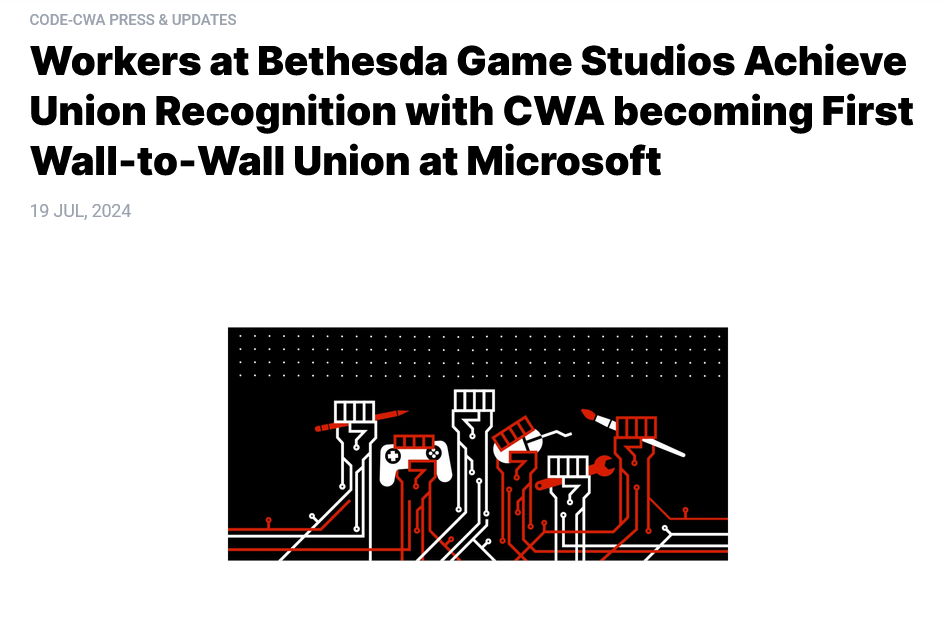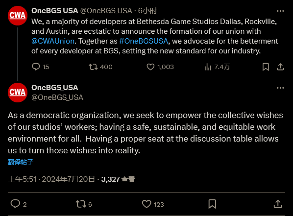 贝塞斯达游戏工作室的开发者日前宣布将与美国通信工人协会(CWA)建立工会。该美国全国性劳工组织也曾与动视暴雪的员工就集体谈判工作进行了合作。