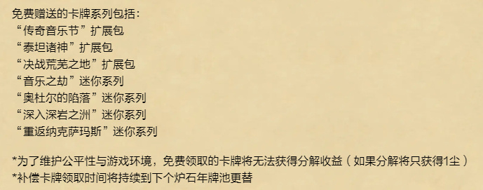 不过需要注意的是,此番官方补偿的卡牌虽多,但免费领取的卡牌是无法获得分解收益的,分解后也只能获得一尘。当然啦,即便如此《炉石传说》的补偿,也让之前的《魔兽世界》国服的补偿看起来充满喜感。