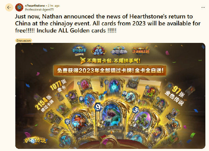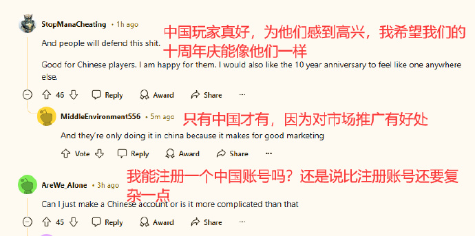 《炉石传说》国服的重新开启,以及对玩家进行的补偿,更让国外的网友破了防。当有人将国服的补偿内容同步过去后,国外玩家表示实名羡慕。对比起来,似乎只有咱们配得上十年庆的规格,有人甚至想注册国服账号爽一爽了。