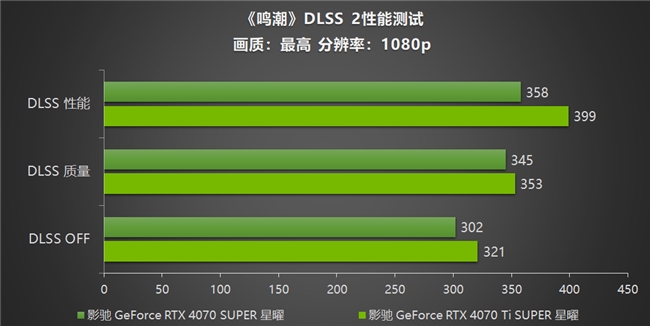 首先进行的是1080p分辨率下的游戏测试,通过数据可以看出《鸣潮》游戏的优化极其出色,同时影驰 GeForce RTX 4070 SUPER 星曜和影驰 GeForce RTX 4070 Ti SUPER 星曜与两张显卡的性能表现也十分优异。凭借着游戏优化与显卡自身性能加持,两张卡的帧数均达到300帧以上。在DLSS质量性能下,影驰 GeForce RTX 4070 Ti SUPER 星曜的成绩甚至直升至近400帧,用实力证明该卡的性能能为玩家提供稳定流畅的游戏体验。