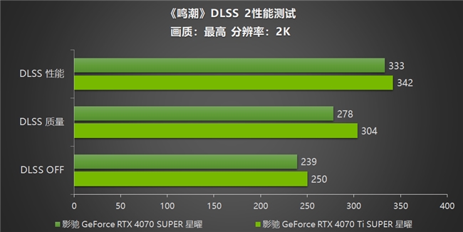 在最为主流的2K分辨率下,影驰 GeForce RTX 4070 SUPER 星曜和影驰 GeForce RTX 4070 Ti SUPER 星曜在《鸣潮》游戏实测中表现也是毫不逊色。两张显卡在关闭DLSS的情况下帧数分别达到了239帧和250帧的优异成绩。开启DLSS 2后,在DLSS 质量模式下两张显卡的成绩均拥有明显的上升,在DLSS性能模式下,帧数更是均上涨了135%以上的优异表现,分别达到了333帧和342帧。NVIDIA DLSS技术的加持,让玩家能够享受在高画质下依旧高帧流畅的游戏体验。