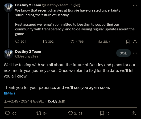在社交媒体上,游戏的开发团队日前发布了一系列帖子,讨论了游戏的未来。团队写道:“我们知道 Bungie 最近的变化给《命运》的未来带来了不确定性。请放心,我们仍然致力于《命运》,以透明的方式支持我们的社区,并将定期提供有关游戏的更新。”
