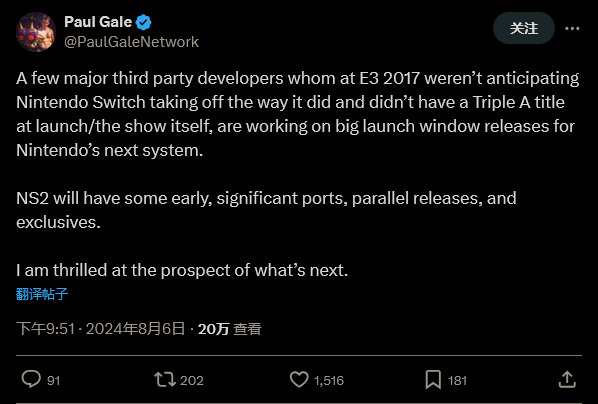 根据消息人士 Paul Gale 在推特上发布的消息称,Switch 2 将由来自第三方工作室的“大作”。他写道:“在 2017 年 E3 上,并没有预料到任天堂囊 Switch 会像后来那样‘起飞’,并且在发布时/展会本身也没有获得 3A 游戏的一些主要的第三方开发商,正在为任天堂的下一个系统开发大型发布窗口作品。”