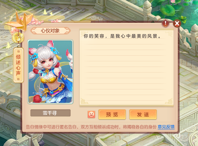 活动期间,三界将开展告白情缘活动,少侠可给异性好友发送匿名情书,让爱意在匿名中绽放。