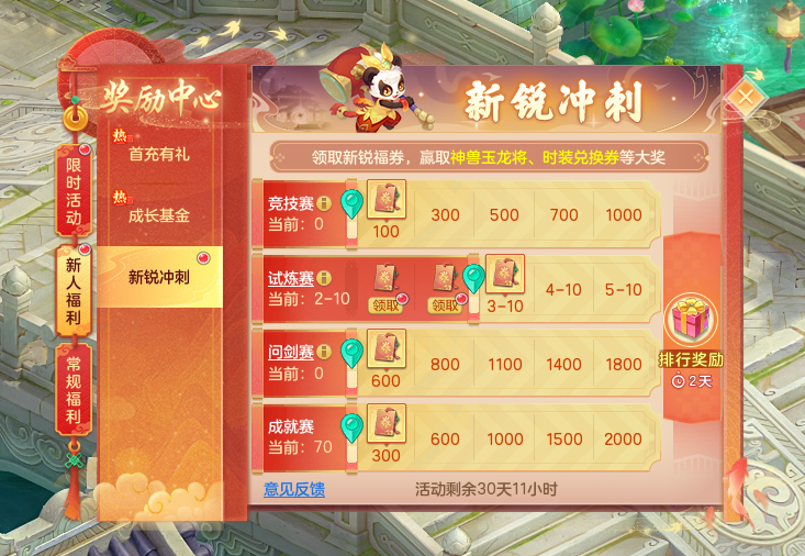 新锐冲刺新赛道开启,冲刺领取更丰富奖励。活动期间达成目标即可领取奖励,更有机会获得神兽玉龙将、时装兑换券等大奖。每周各赛道名列前茅的少侠还能获得专属的头衔称谓奖励,一起来冲刺吧!