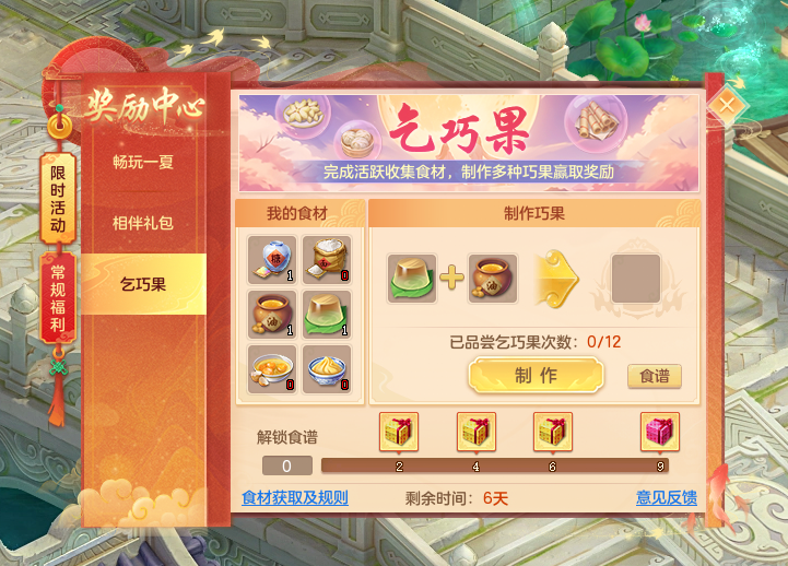 七夕佳节,三界相会!七夕系列活动同步开启。少侠们完成活跃进度可获得制作乞巧果的食材,通过不同的食材搭配获得各类乞巧果。解锁越多乞巧果种类,获得奖励越丰富。