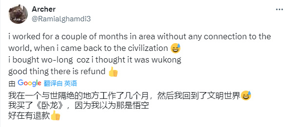 当前在推特上,已经有国外的网友呼吁玩家们在入手《黑神话:悟空》时,仔细辨别游戏的本体内容。因为《卧龙:苍天陨落》与之相当接近,如果光看拼音的话确实容易看错。