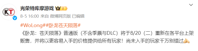 然而近期,光荣特库摩突然宣布《卧龙:苍天陨落》即将重售,并且发售日期也是8月20日。如果说,事情到了这一步还是巧合的话,二者极为相近的字体样式、海报颜色,就真的很容易让人混淆了。